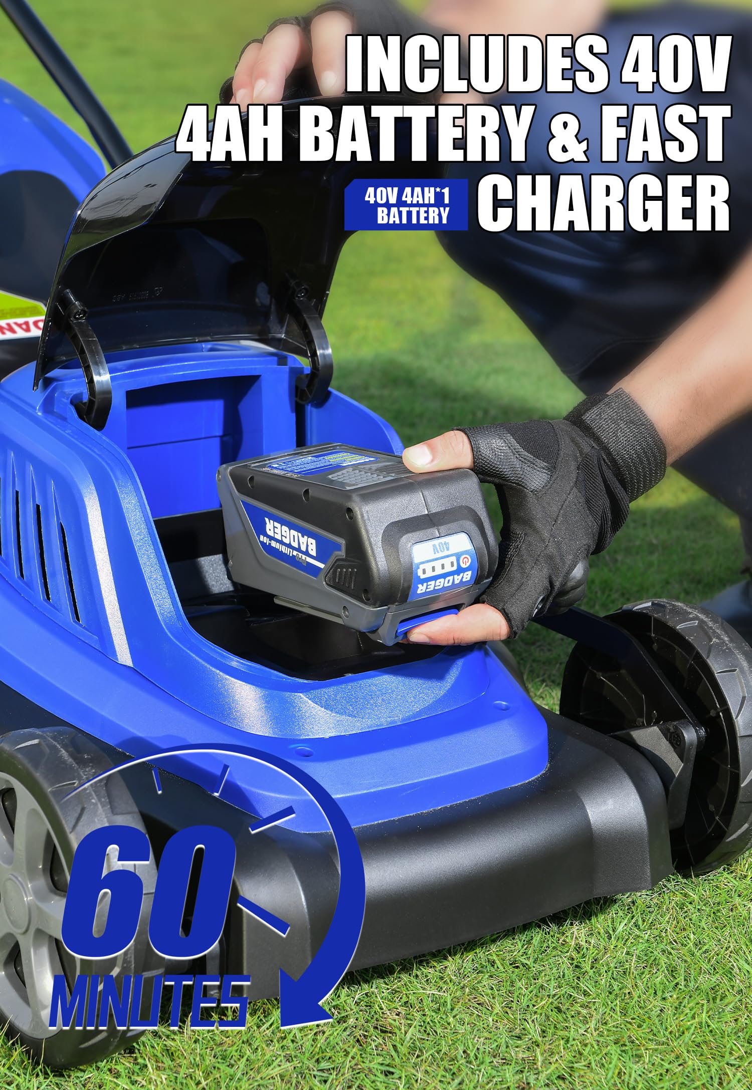 BATTERY & RUNTIME—Includes 1× 4.0Ah 40V pack + fast charger; mows up to 5,445 sq ft (0.125 ac) per charge;typical 60 min/charge(varies).