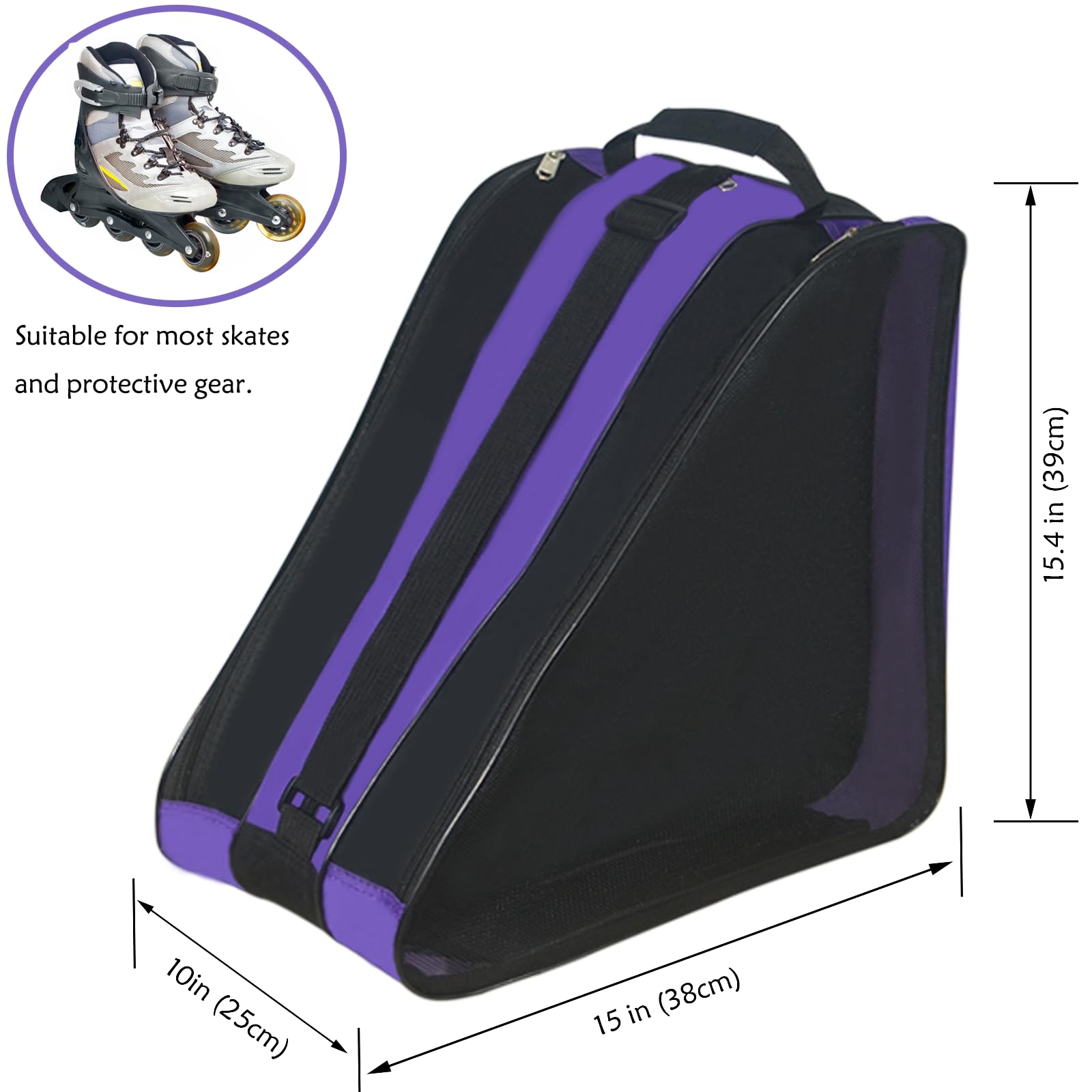 Large Capacity: The size of the roller skating bag is 15.4*15*10 inches/39*38*25 cm. It has 3 compartments. The left and right sides are made of breathable mesh. They can hold roller skates or quad skates. The middle space can put ice skating socks helmet protective gear and accesorios para patines.