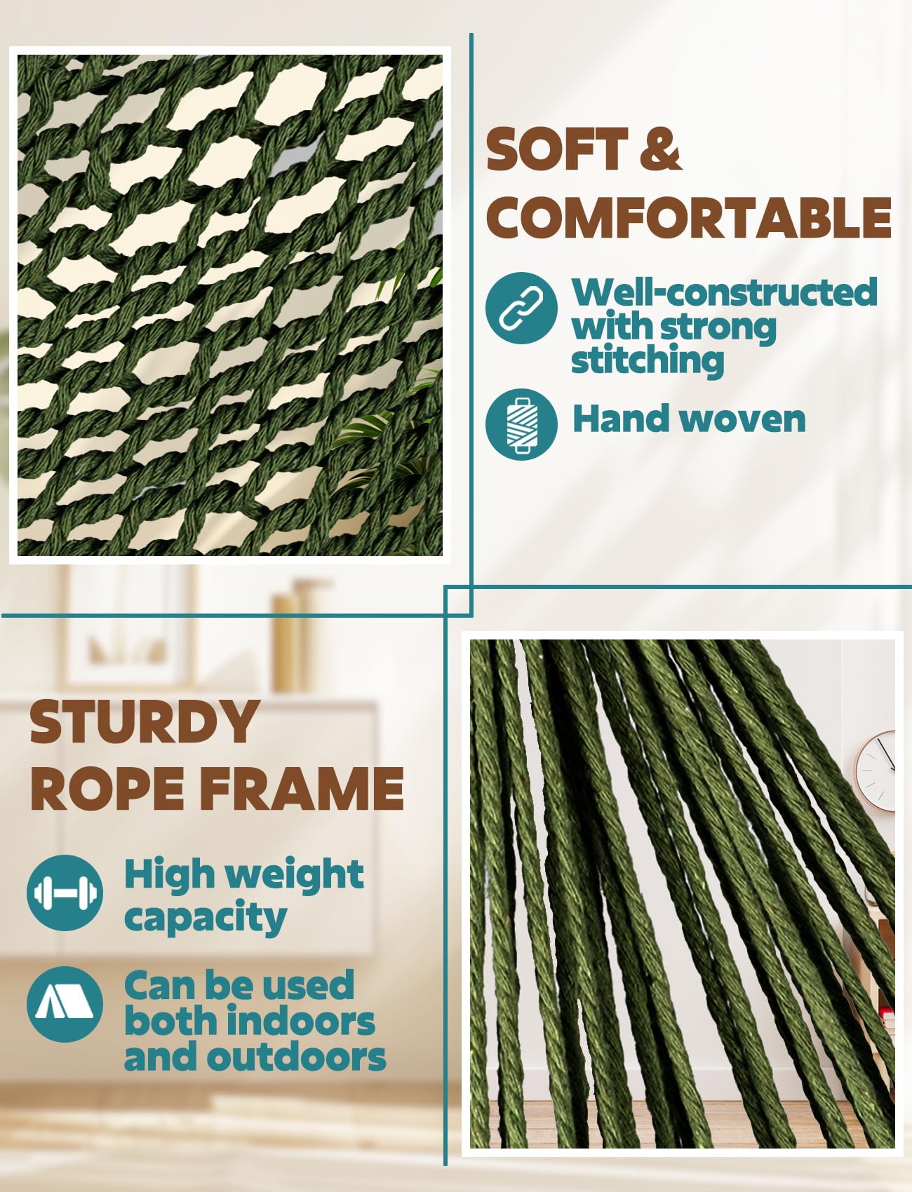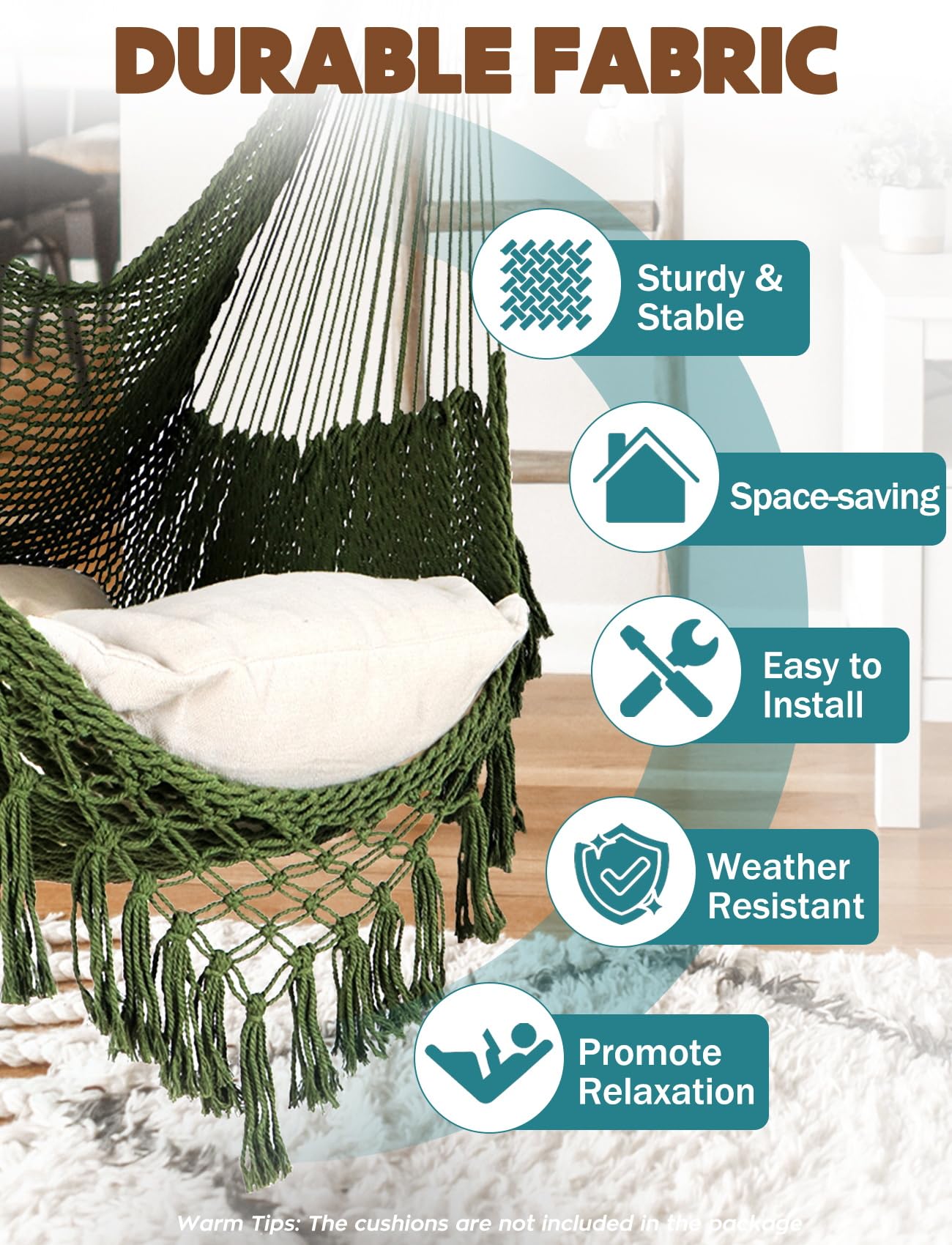 Comfort and Health benefits: They offer a gentle swaying motion that can be very soothing.Hammock chairs are incredibly comfortable and provide a unique sitting experience that can offer several health benefits, including improved circulation, reduced muscle tension, and better sleep quality.Strong metal spreader bar promotes your long lasting enjoyment.