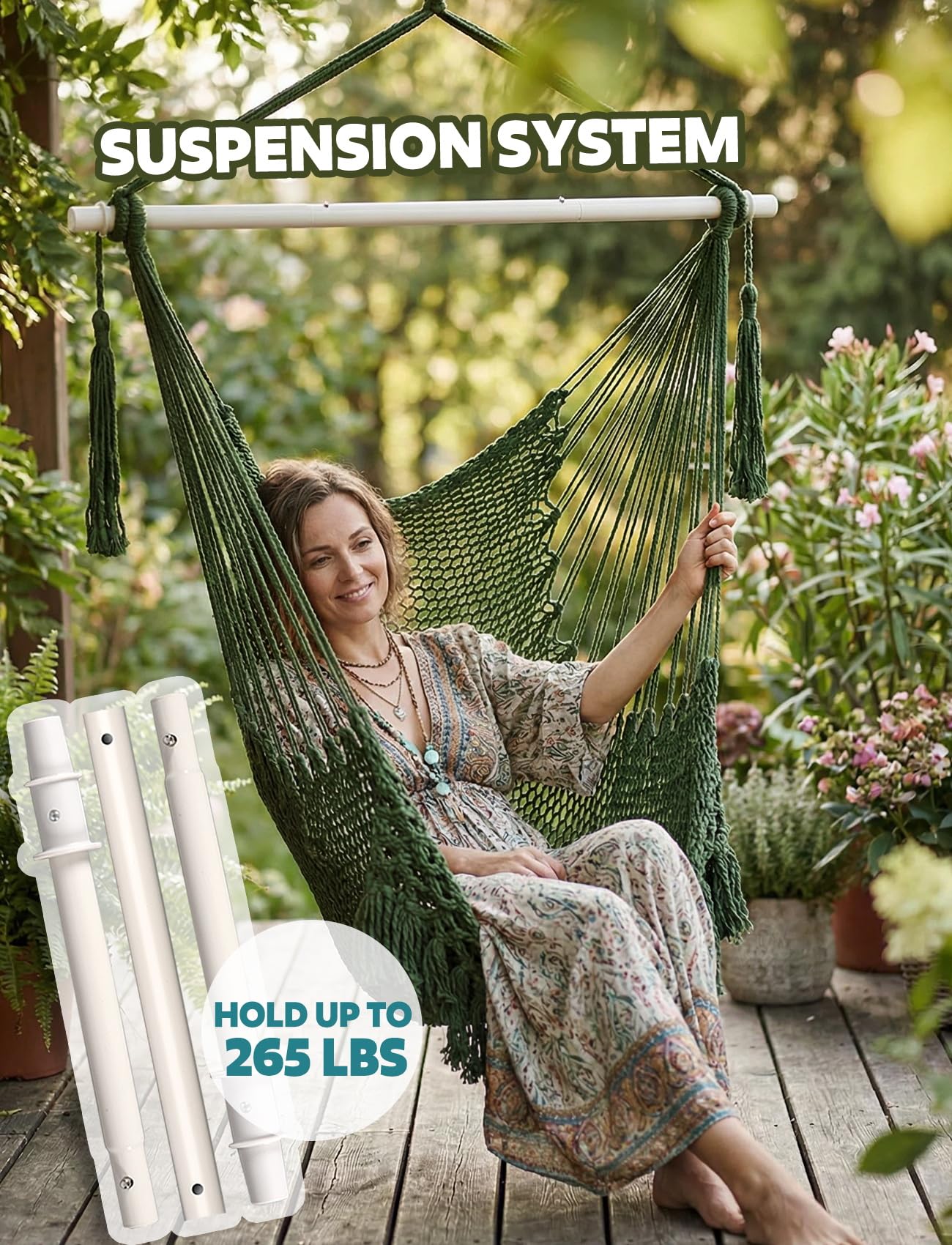 Design:Handcrafted from comfy and durable cotton ropes of the entire chair promise enjoyment and that is well-constructed with strong stitching and a sturdy frame to ensure safety and comfort.100 cm(3 1/3 ft) length wide spreader bar provides ample shoulder room.Extra long built in footrest to really stretch out .The mesh lets the cool breeze blow your body, breathable and cool.Anti-slip poles provide a stable and secure seating experience, preventing from slipping or sliding off the chair.