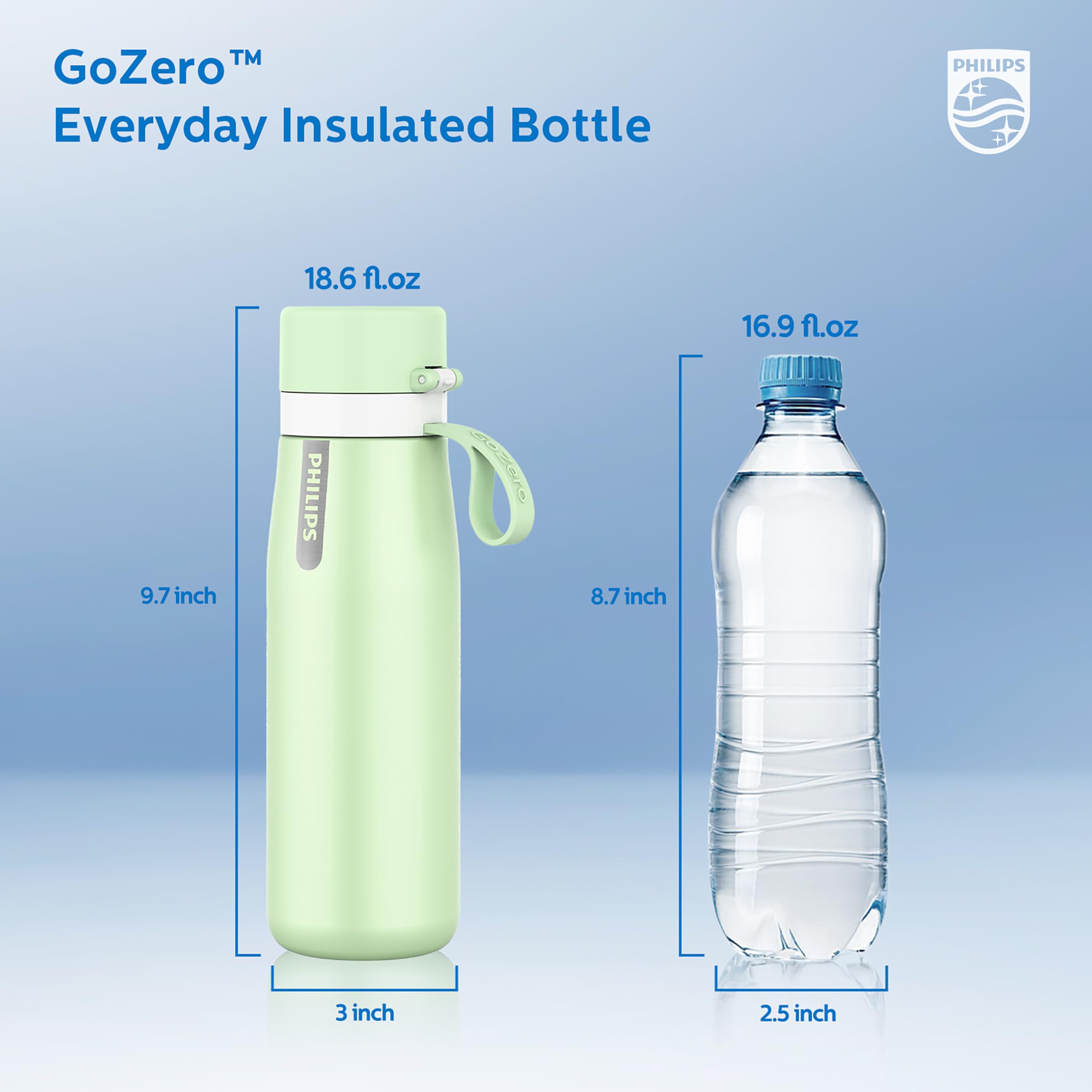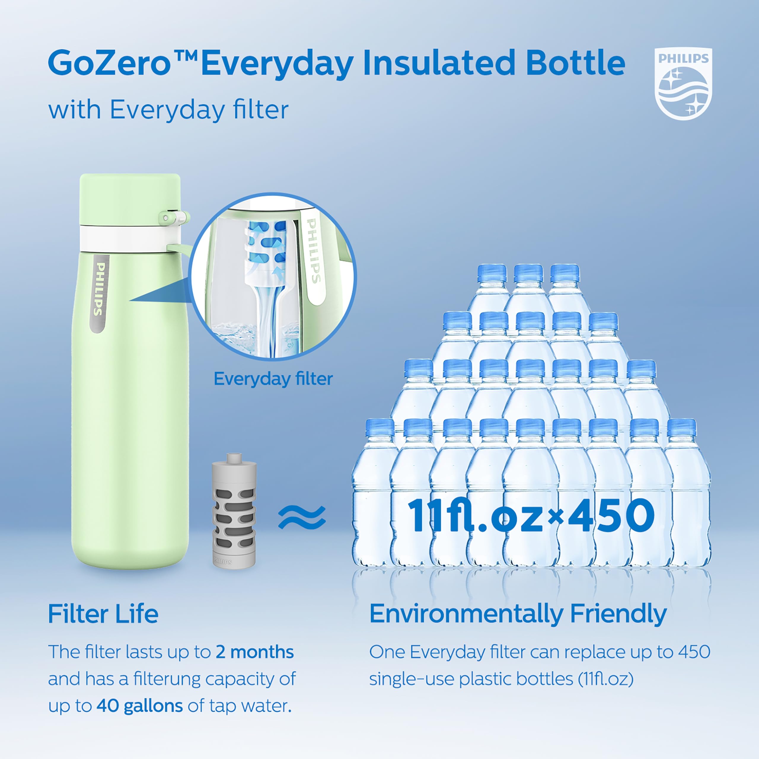 ★ 𝐆𝐨𝐨𝐝 𝐅𝐨𝐫 𝐄𝐧𝐯𝐢𝐫𝐨𝐧𝐦𝐞𝐧𝐭: Save the environment by replacing 450 single-use plastic bottles with just one Philips GoZero Everyday filter. Using the reusable water bottle lowers your carbon footprint and helps contribute to a healthier planet by reducing your use of disposable bottles.