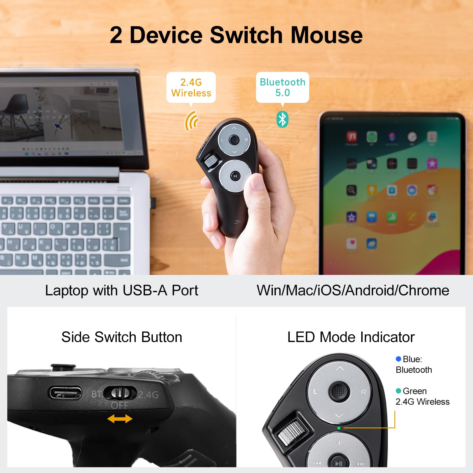 Two Device Connection & Rechargeable - Connect effortlessly via Bluetooth 5.0 or 2.4GHz wirelessβswitch between devices with a button. Built-in LED indicator helps you confirm connection mode at a glance. Working distance: 32 feet. Default DPI: 2000. Come with a Type C - USB A cable for charging, this wireless clicker mouse provides 75 hours of constant use on a charge or 83 days of standby time.