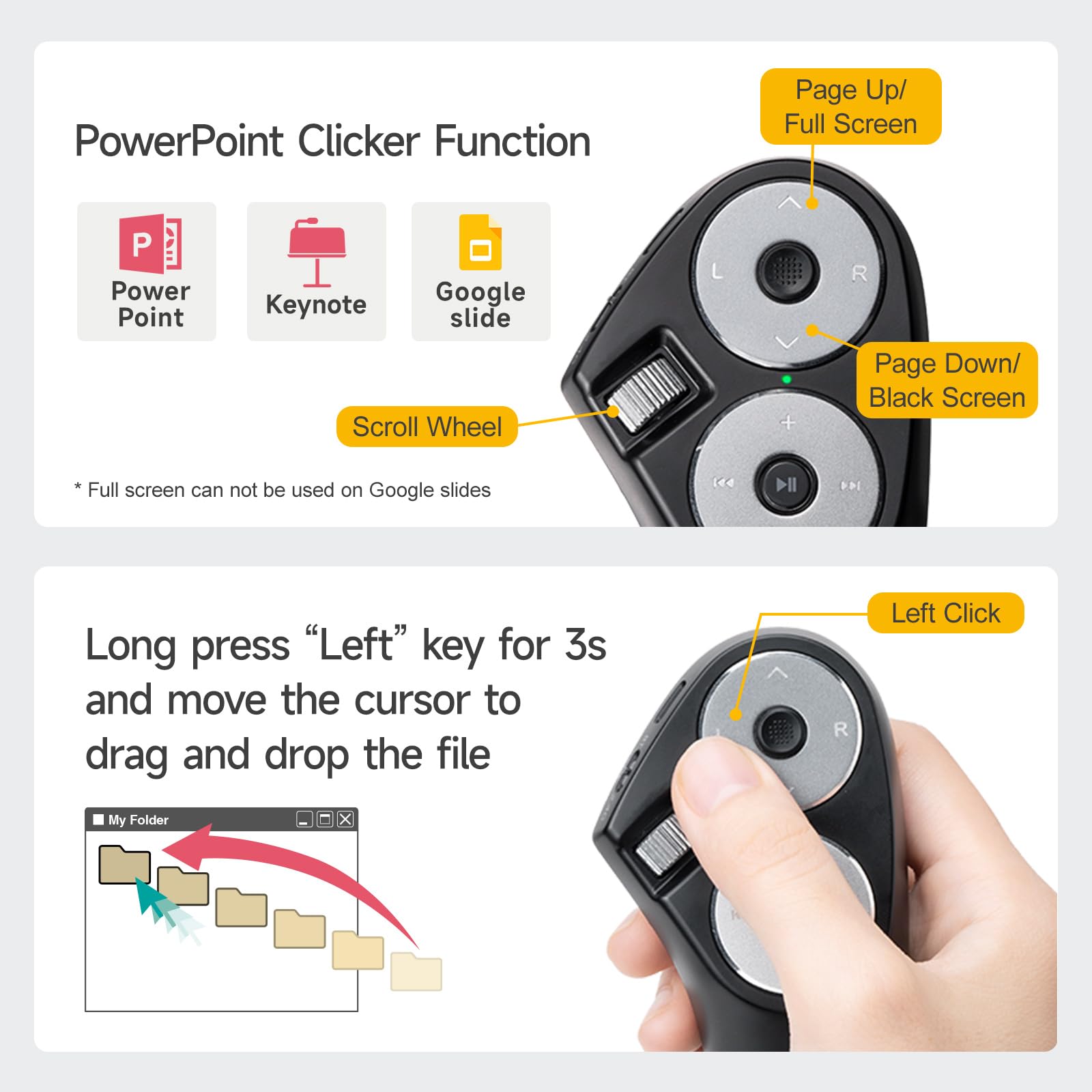 Volume Control & eBook Page Turner - This product supports operations including scrolling up/down, turning eBook pages, playing/pausing videos, and adjusting volume. The wireless clicker mouse is compatible with Windows 11/10; mac OS 14/13/12; Chrome OS; Android 13-14; iOS 14-17; iPad OS 14-17 and versions later on. Support 3 kinds of PPT software: PowerPoint, Keynote, Google Slides.