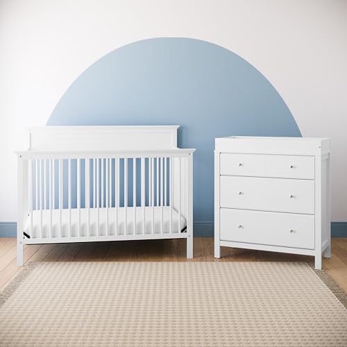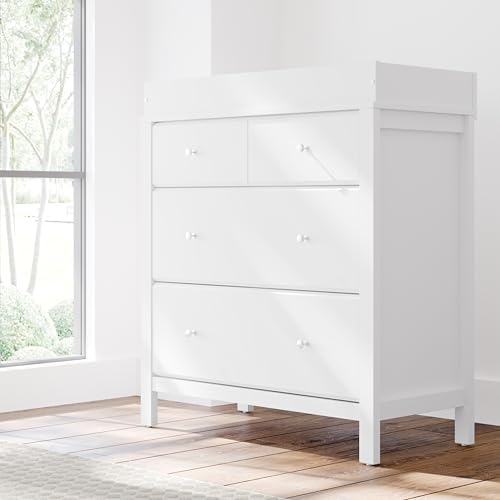 βGROW-WITH-MEβ 3 DRAWER CHEST β REMOVABLE CHANGING TABLE TOPPER: Crafted of wood composites and laminated with a durable, easy-to-clean PU-coated surface; Pre-installed drawer tracks make for an easier assembly experience; Changing pad not included