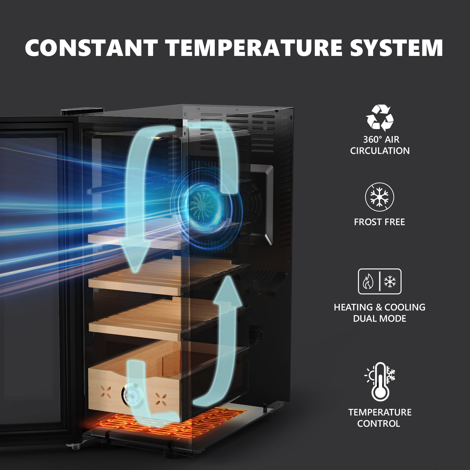 Dual function of refrigeration and heating:The Electric Cigar Humidorst has dual functions of refrigeration and heating. Storage environments are smarter. The humidor works without vibration, saving energy