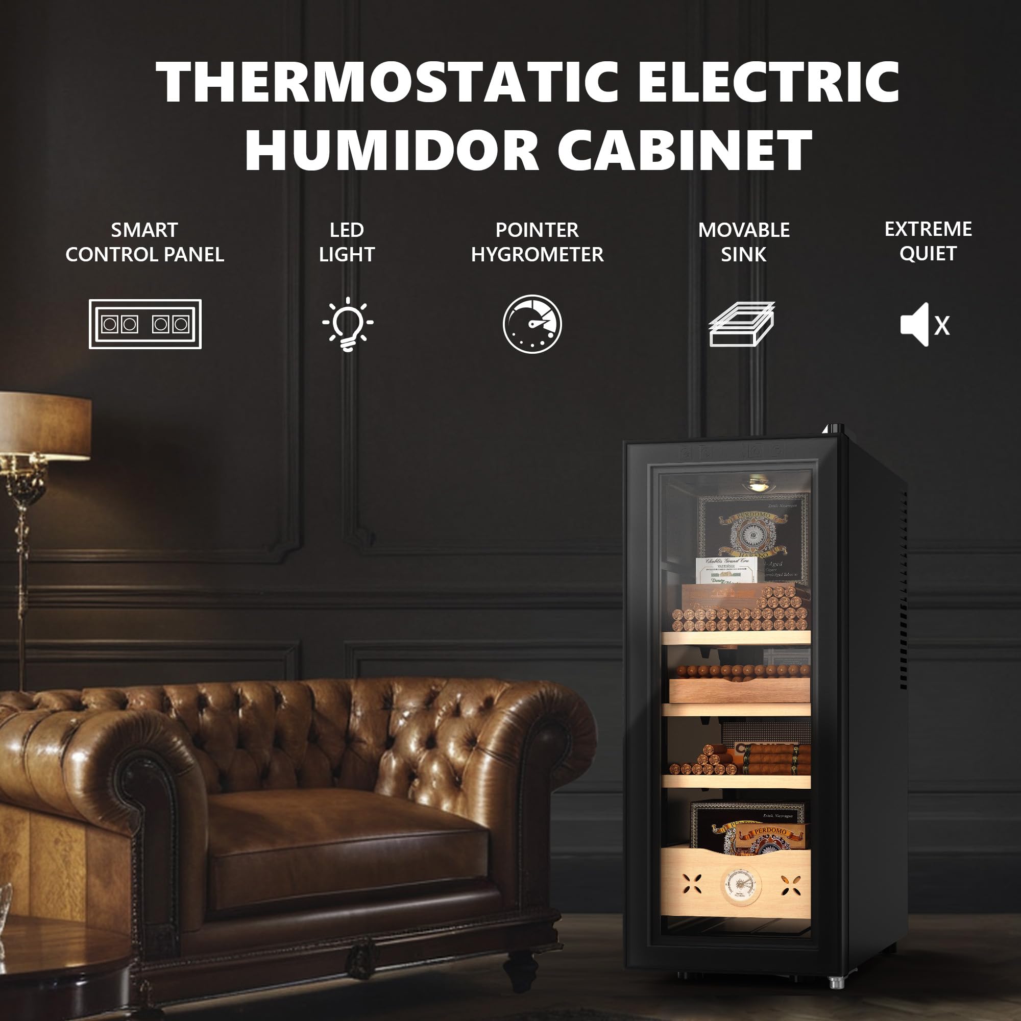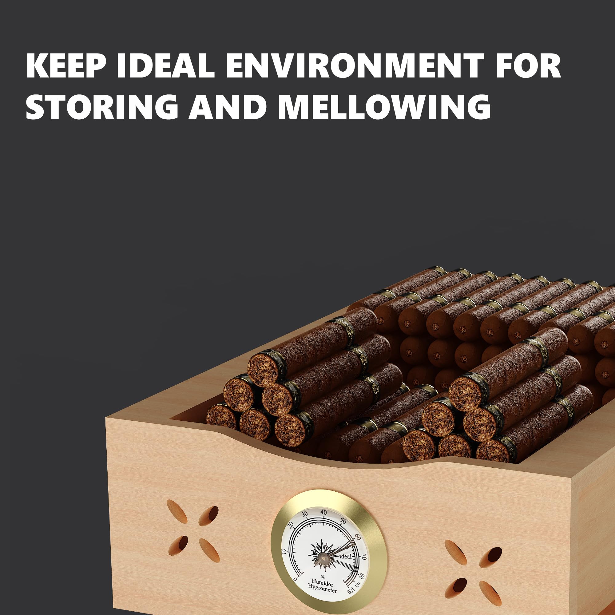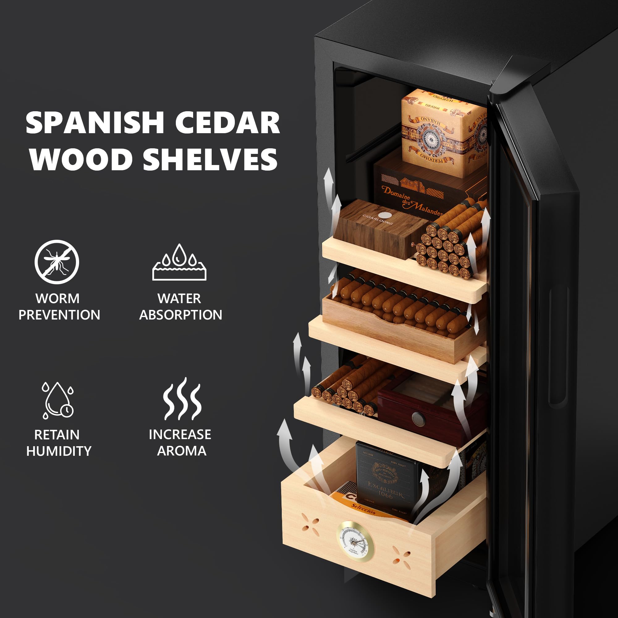 Large capacity & Flexible Storage OptionsThe 35L capacity humidor has 3 different layers of storage Spain cedar wood frame, different capacity sizes and removable partitions, providing flexible placement space for loose cigars and humidors, ensuring optimal organization. The bottom pull-out accessory drawer has a retractable handle to store additional cigar accessories or cigar collectibles