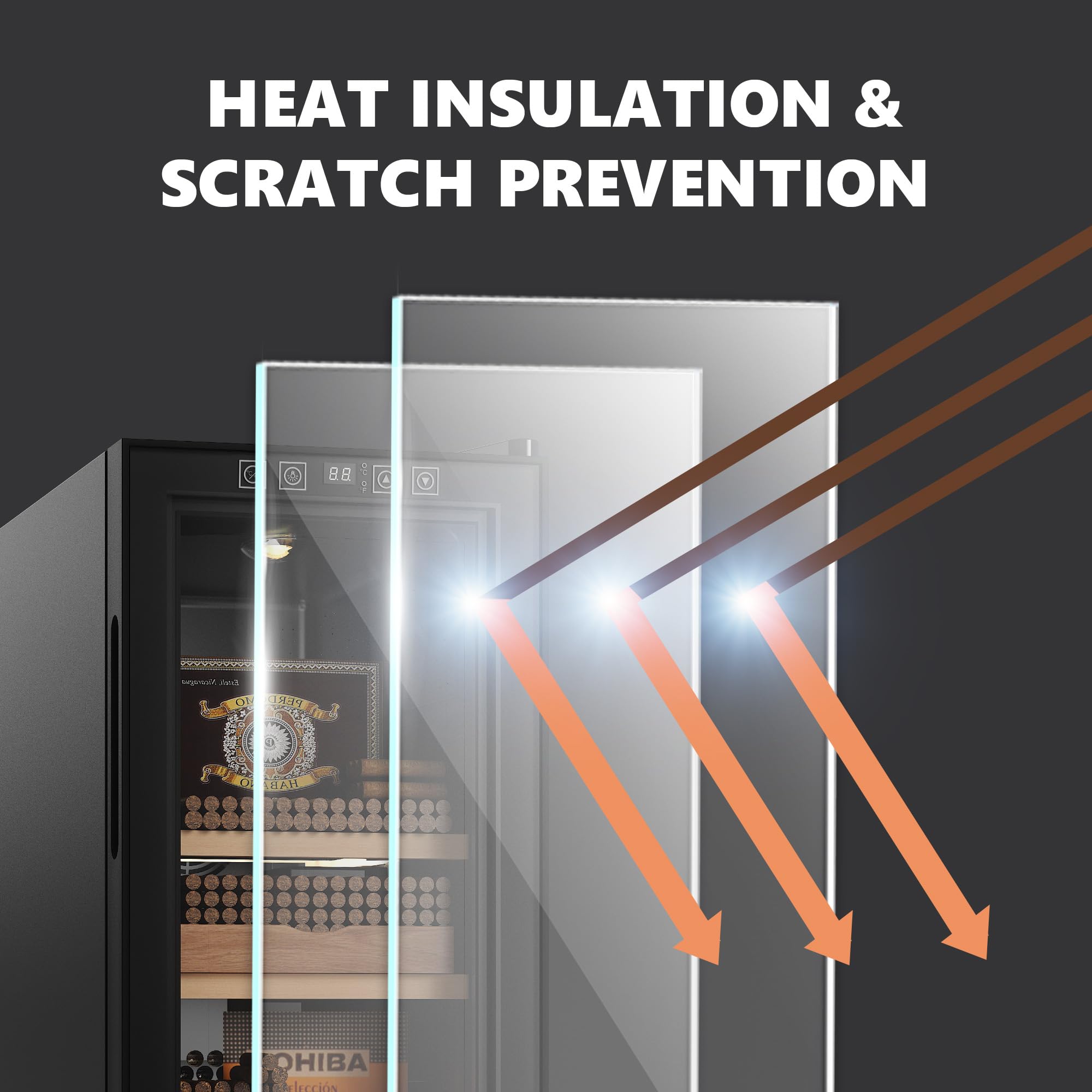Dual-Pane Glass &Digital Display:The exterior blackout glass insulates UV rays, while the inner thicker glass effectively retains heat while ensuring superior door sealing. The touch controls are seamlessly integrated into the glass panel for greater ease of operation