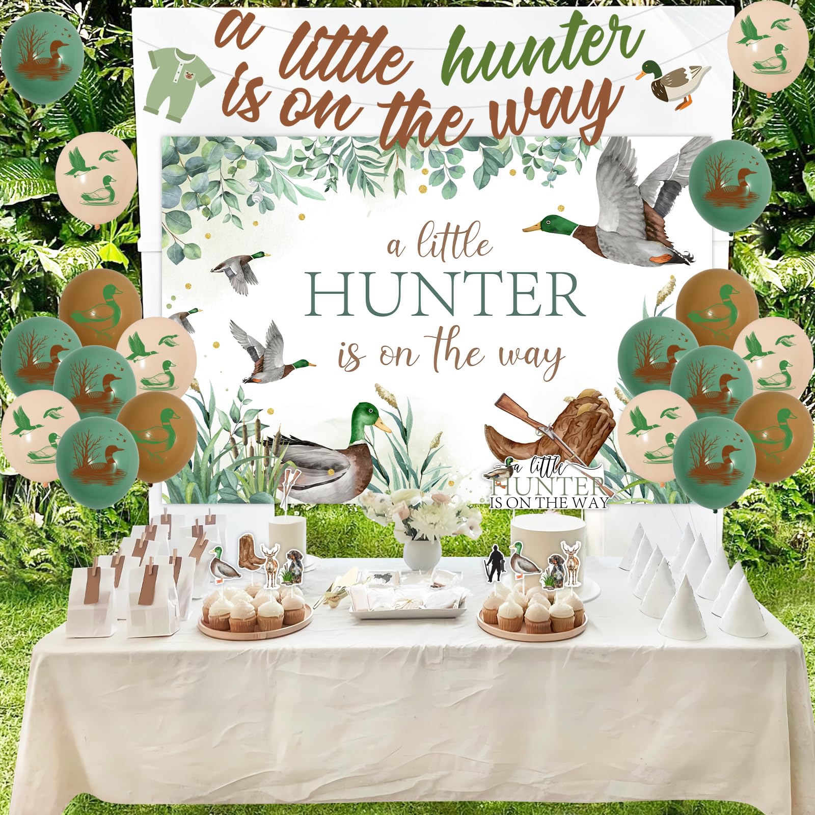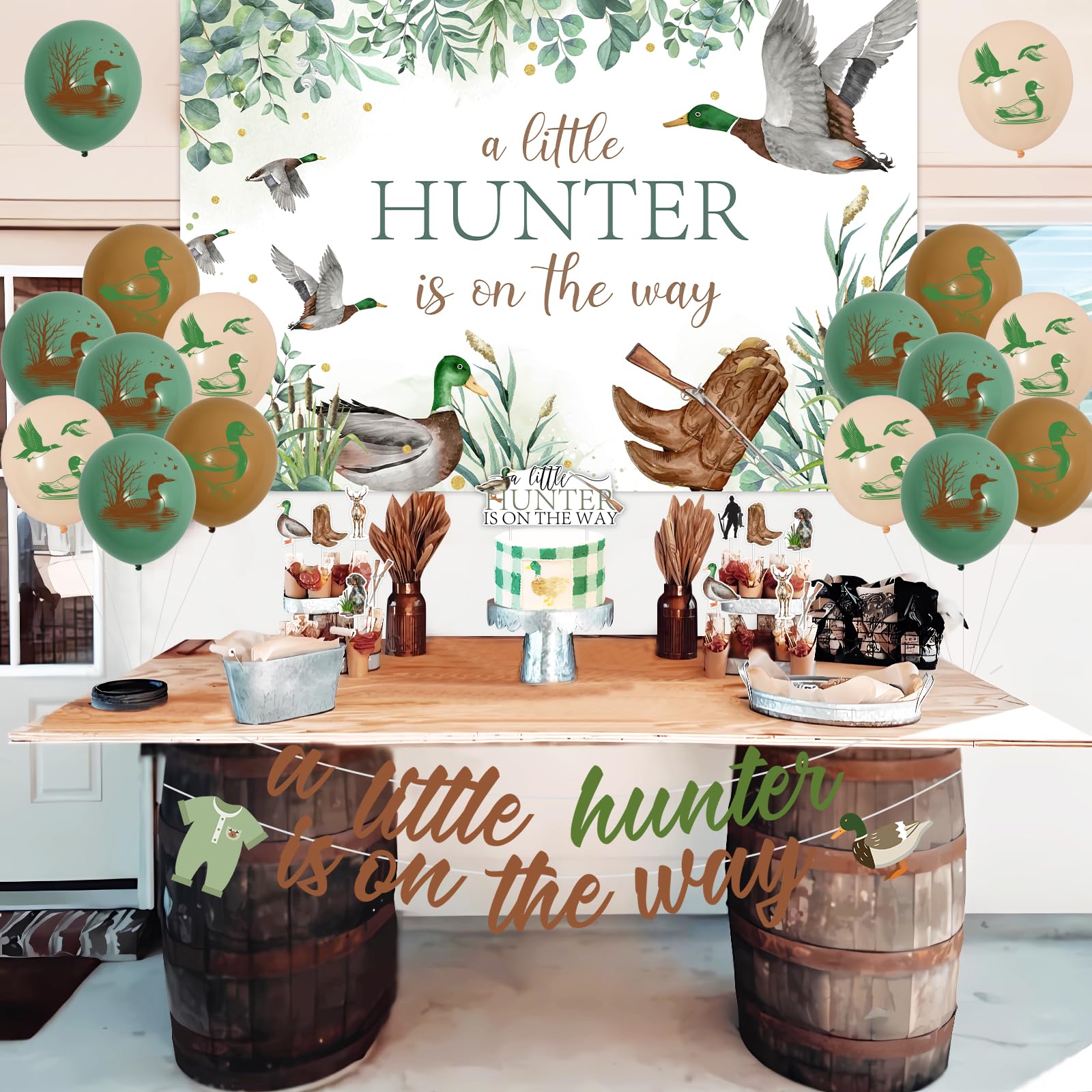 Duck Hunting Design: The letters a little HUNTER is on the way is written on the backdrop, cake topper and banner. There are many duck hunting elements in kits, including mallard duck, reeds, hunting boots, gun, dog, deer patterns. Suitable for duck hunting and a little hunter is on the way theme party.
