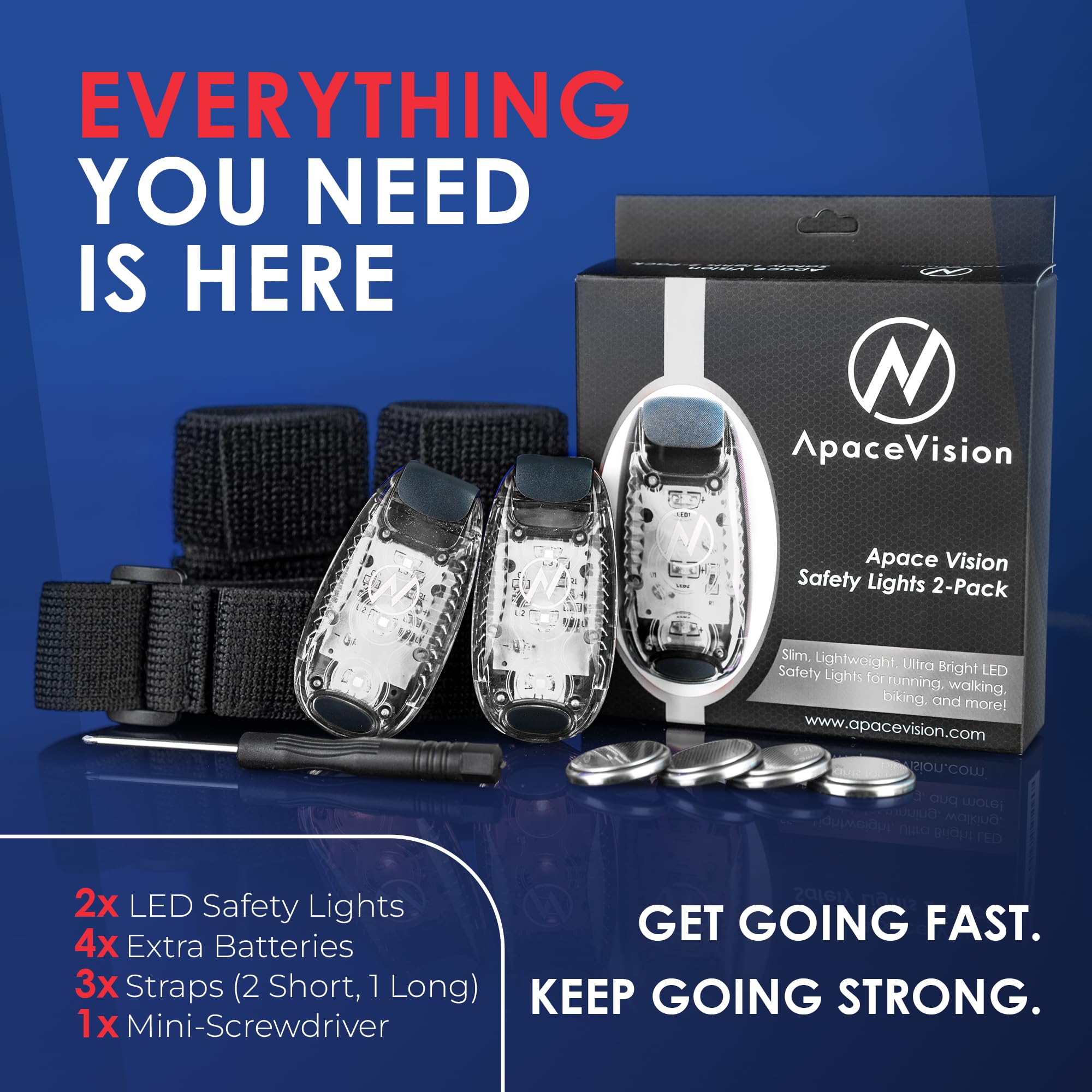 FULLY CONFIGURED, GENEROUS ACCESSORIES: Includes 4 extra CR2032 batteries (2 sets), complete with a mini-screwdriver for hassle-free battery replacement. 2 sturdy hook and loop fasteners mount your lights securely to dog collars, leashes, bikes, strollers, and more. 1 long, 15.8" ELASTIC strap binds your lights comfortably to ankles / wrists / arms etc. Here’s visibility you can count on, and a quality build you can feel, all strapped firmly in place. For leisure, exercise, sports etc.