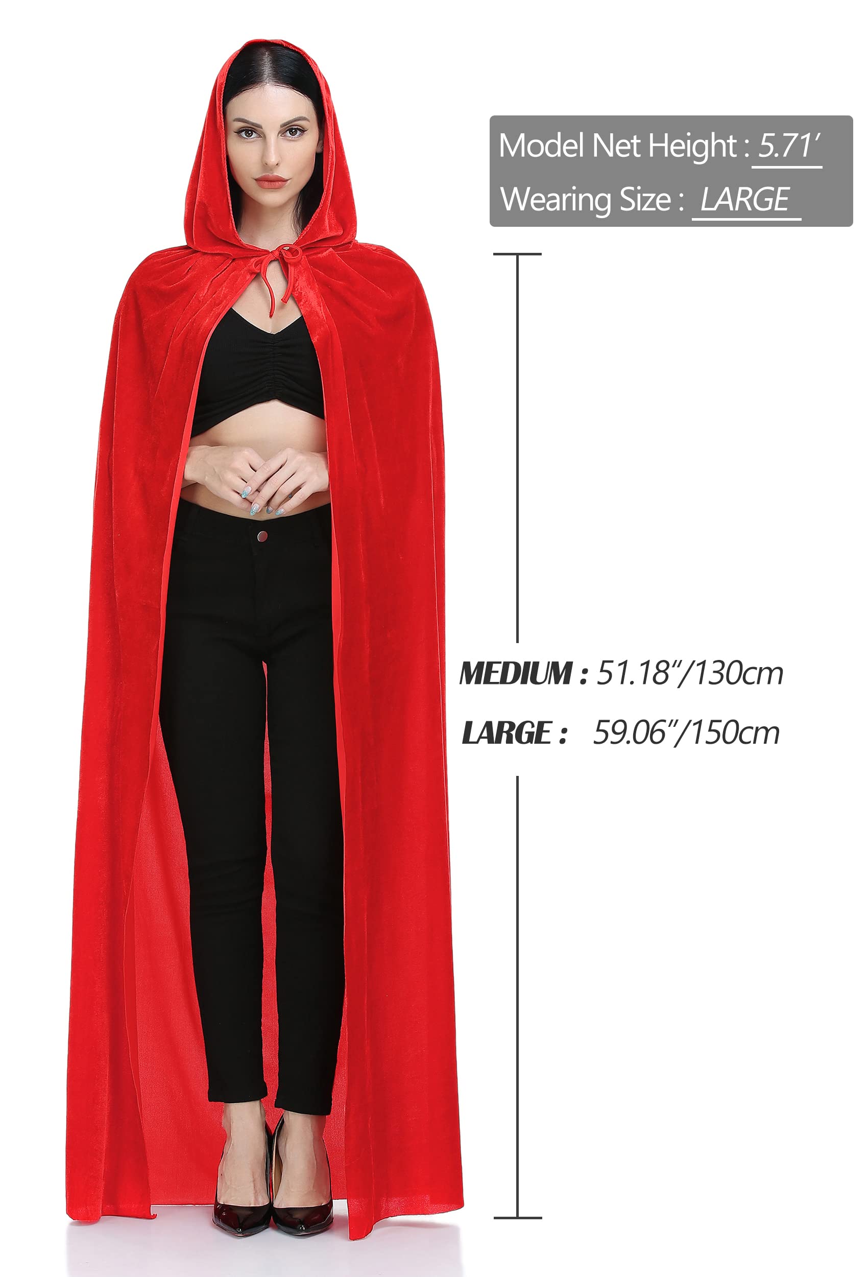 Unisex Hooded Cloak: Length(from collar to hem) of M is 51.18", fit for 4'6"-5'6" tall teens and adults; L is 59.06", fit for 5'4"-6'4" tall adults. Full length unisex design generally used for both female and male.