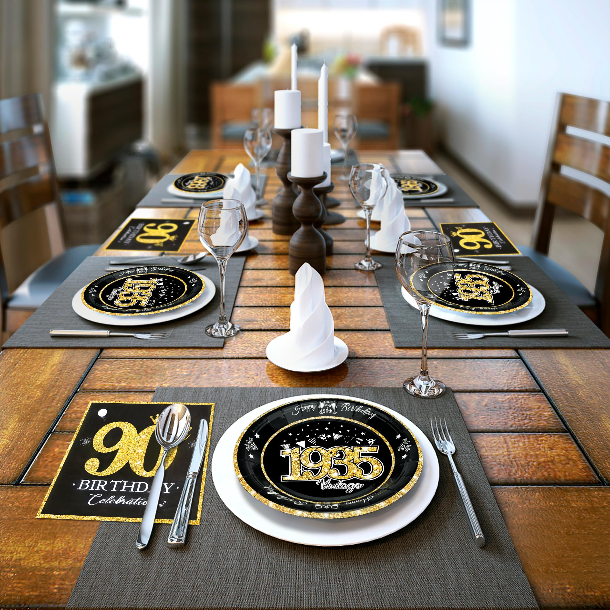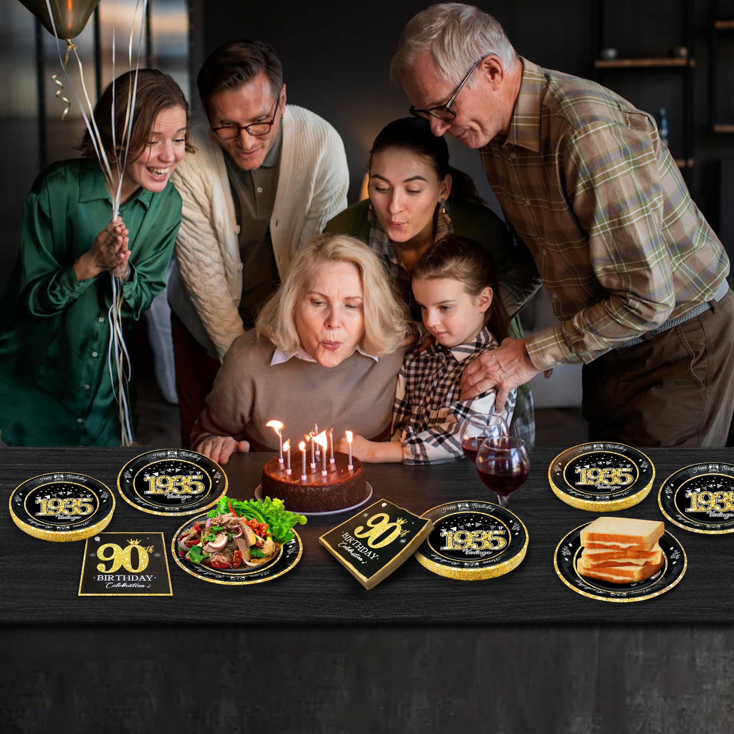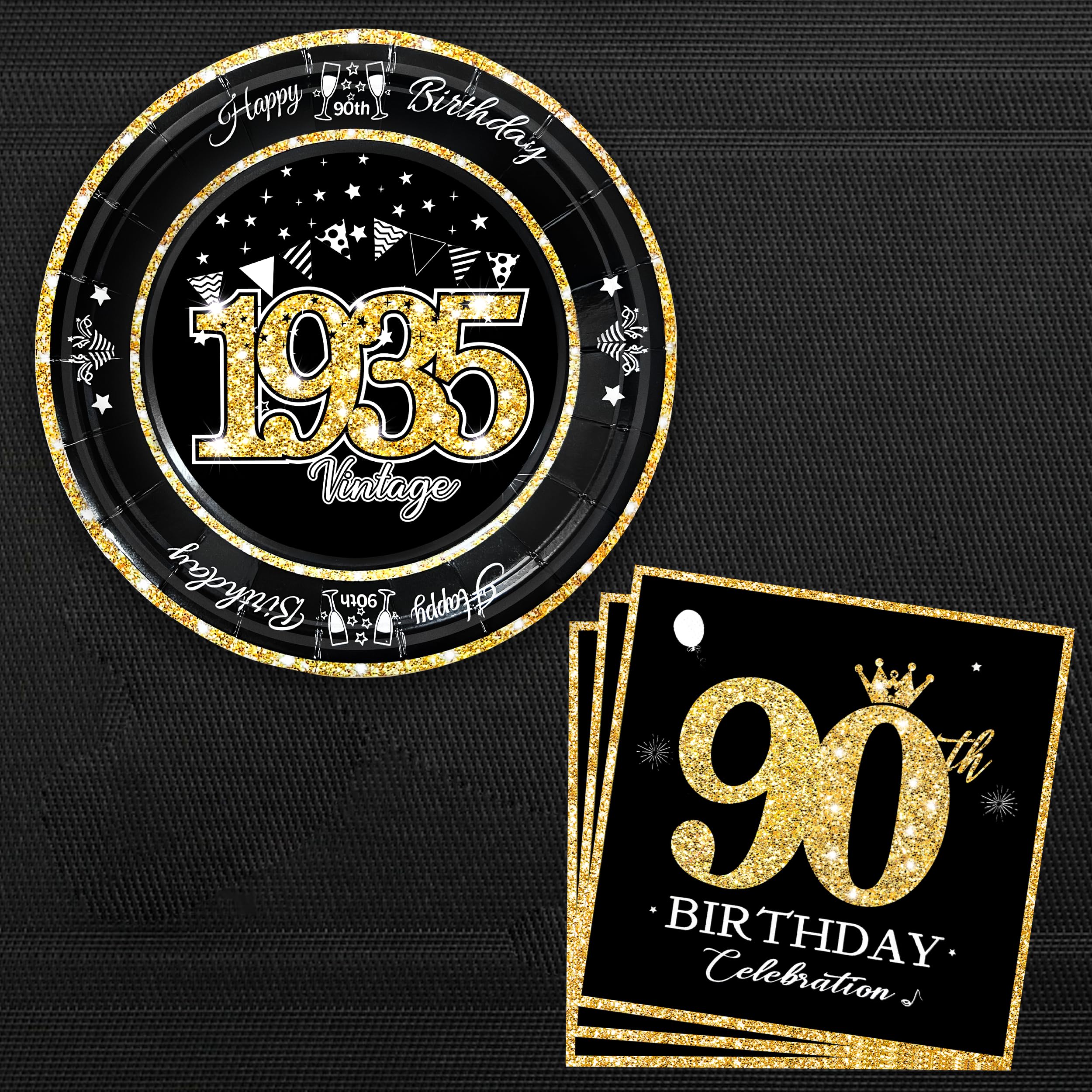 Elegant Vintage 90TH Birthday Design: This birthday plates and napkins set featuring a glittering gold font and vintage design style will match perfectly with black and gold 90th birthday decorations. This 90th birthday gold glitter 'Vintage 1935' plates will blow all people away! Absolutely, that can add an elegant to the celebration and be the most beautiful decoration on the table