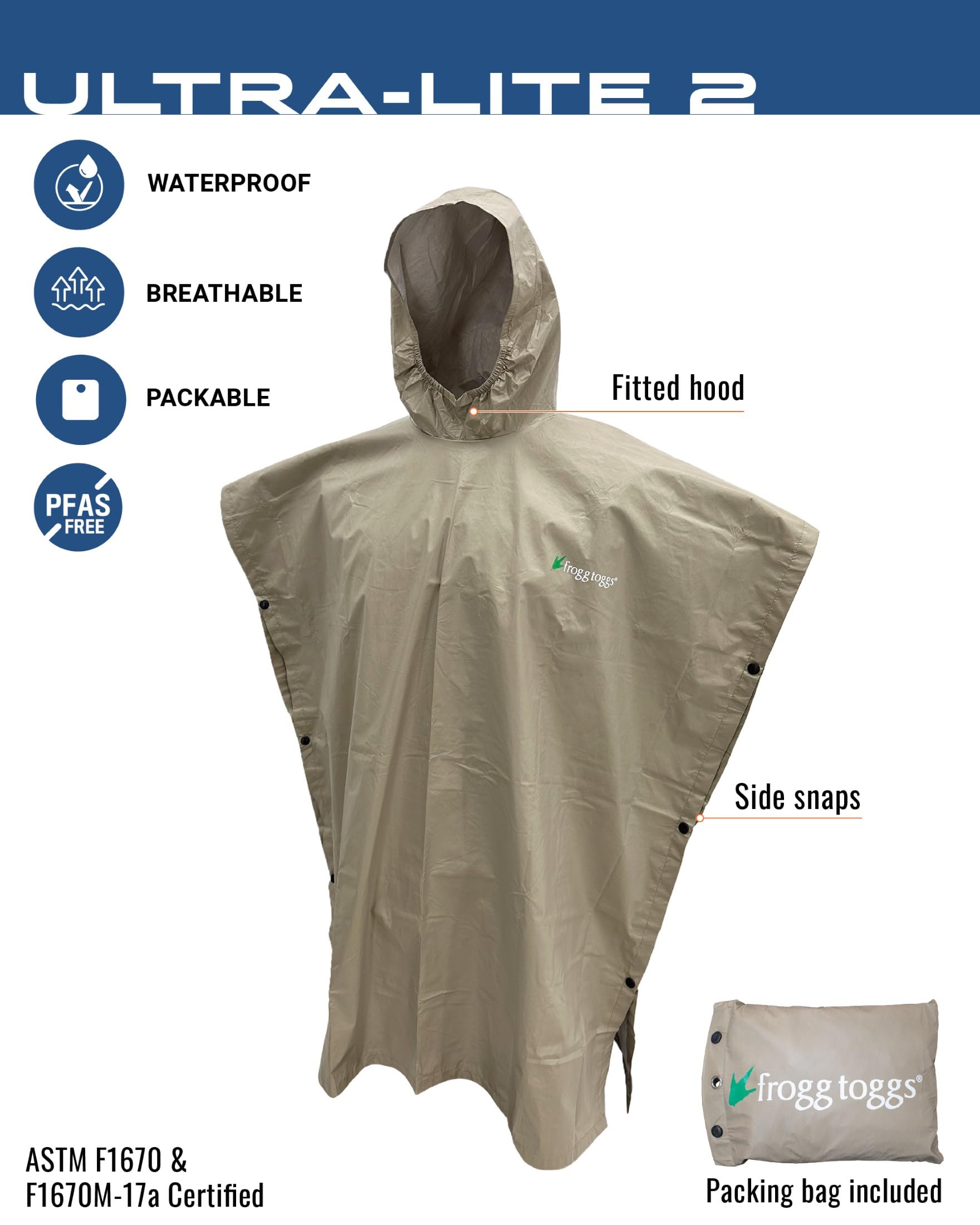 Description Equip yourself with the frogg toggs Ultra-Lite2 Rain Poncho for supreme rain protection. This poncho boasts an adjustable, attached hood with cord locks and side snaps for enhanced defense, providing full coverage in heavy rain. It compacts into its included stuff sack and weighs just 9 oz., offering a lightweight, portable solution for unpredictable weather. The Ultra-Lite 2 is certified to meet the ASTM F 1670/F 1670M - 17a standard as a PPE garment.