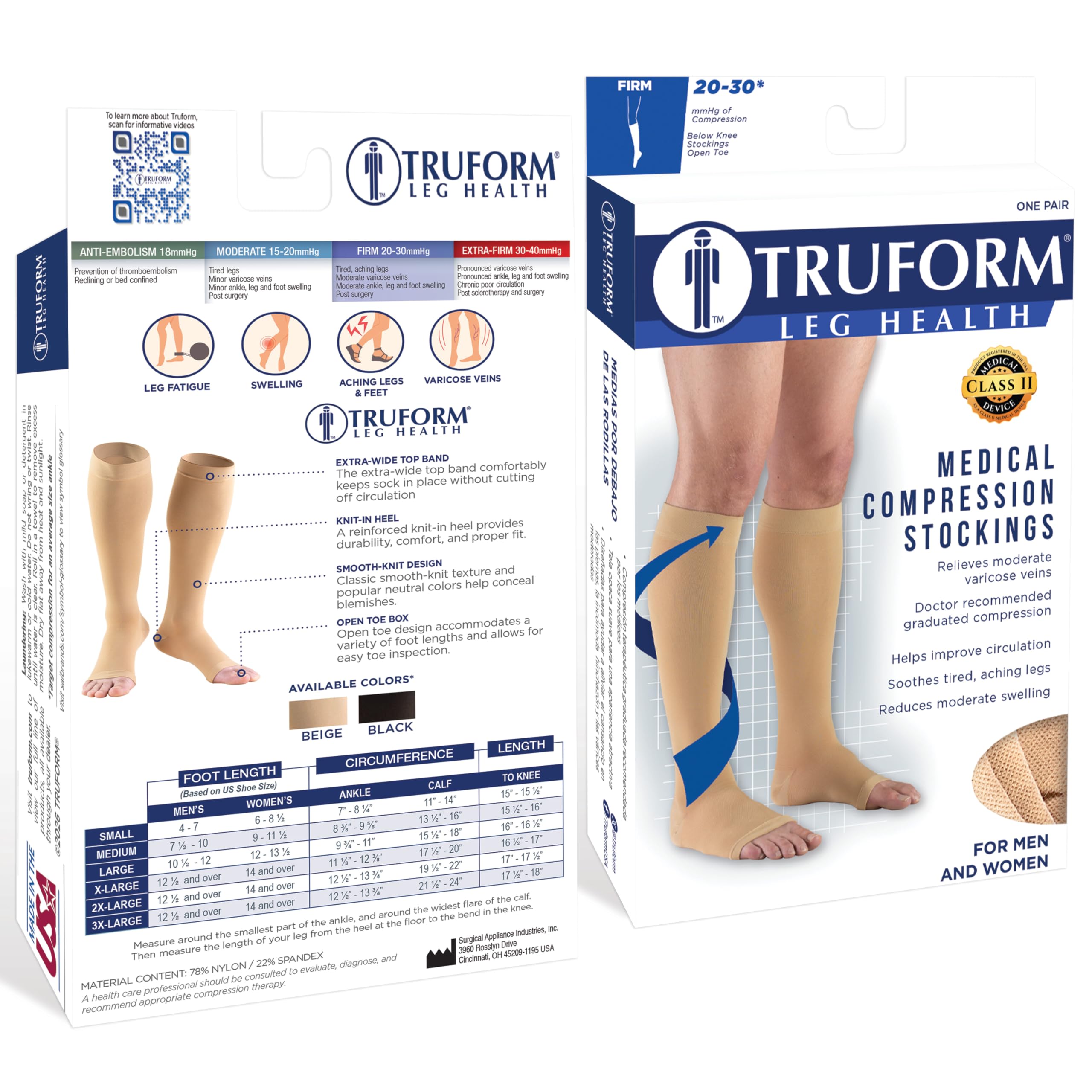 Product Description Truform 0865 was created to help relieve conditions associated with poor circulation. Graduated compression technology delivers a compressive action to the leg that is greatest at the ankle, then gradually decreases toward the heart. The 20-30 mmHg Firm compression level is great for post surgery and severe edema, varicose veins, hypotension, post thrombotic syndrome (PTS), post sclerotherapy, and more. Truform therapeutic medical stockings feature classic styling and a smooth knit fabric that helps conceal unsightly conditions. The open toe feature allows for easy toe inspection and permits one standard size to fit a variety of foot dimensions. Color options are basic neutrals for all-occasion wear. Truform stockings, socks and pantyhose feature Graduated Compression Technology, which delivers a compressive action to the leg that is greatest at the ankle, then gradually decreases toward the heart. Graduated compression provides two primary benefits: it helps lessen and treat swelling for the wearer, and the compression action help to prevent the slowing of blood flow so it can flow more quickly up the leg back toward the heart. Truform graduated compression support hosiery helps maintain positive circulation and leg health. We take the extra time and effort necessary to insure a therapeutically effective, comfortable fit. The combination of state-of-the-art materials and equipment, plus knitting know-how sets Truform apart from the crowd to make your legs look and feel great. Choose short length size when length from heel at floor to back bend of knee measures less than 15 inches. Manufacturer Contact Information 3960 Rosslyn Dr, Cincinnati, OH 45209