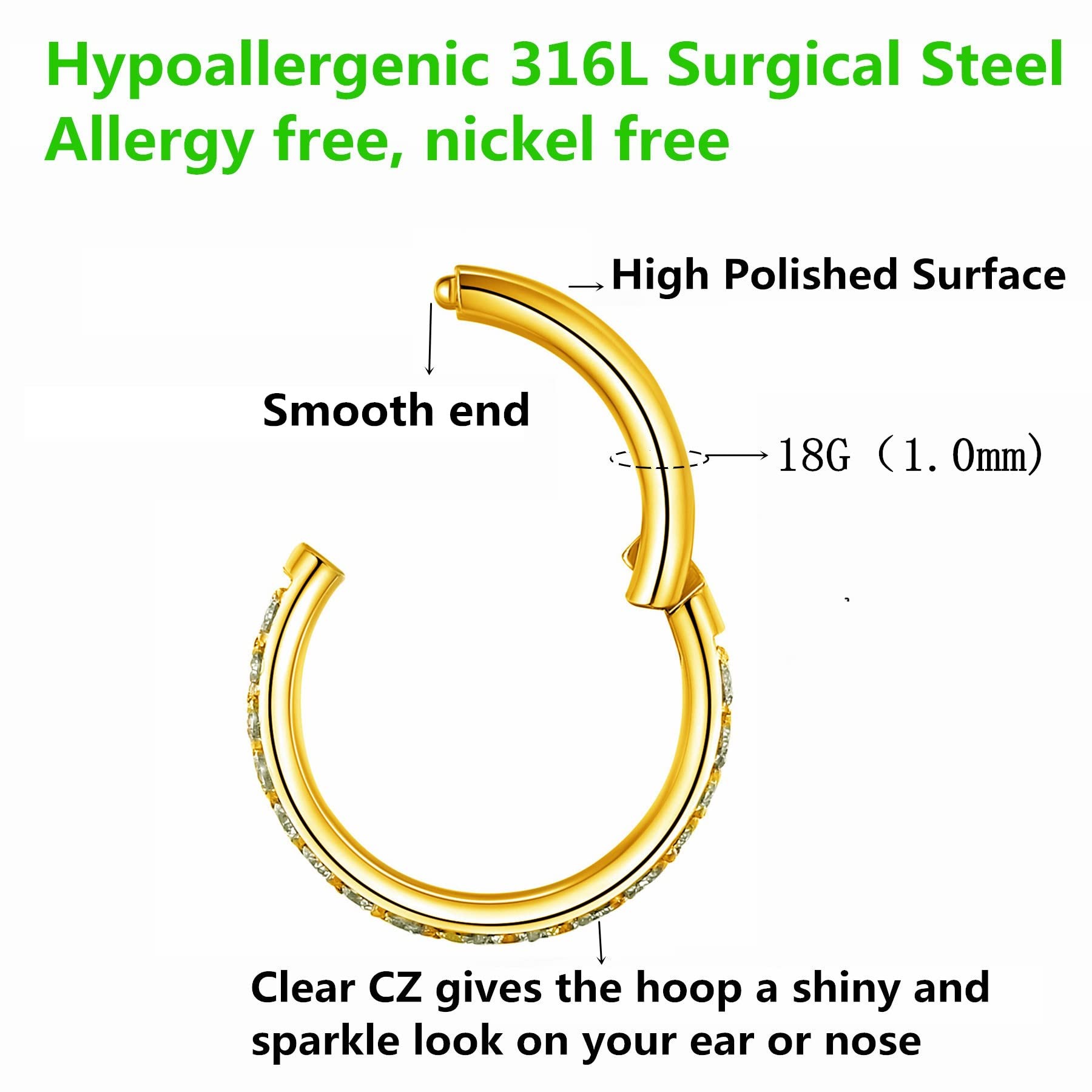 Hypoallergenic: Made of 316L surgical stainless steel(lead-free, nickel-free, and hypoallergenic,) won't infect your skin, sturdy and durable, can be safely used for a long time.Has a High polished smooth surface and void of sharp edges, no irritation to your skin, comfortable for daily use.Clear CZ gives the hoop a shiny and sparkle look on your ear or nose, the classic silver color and simple design can be used for any occasion.