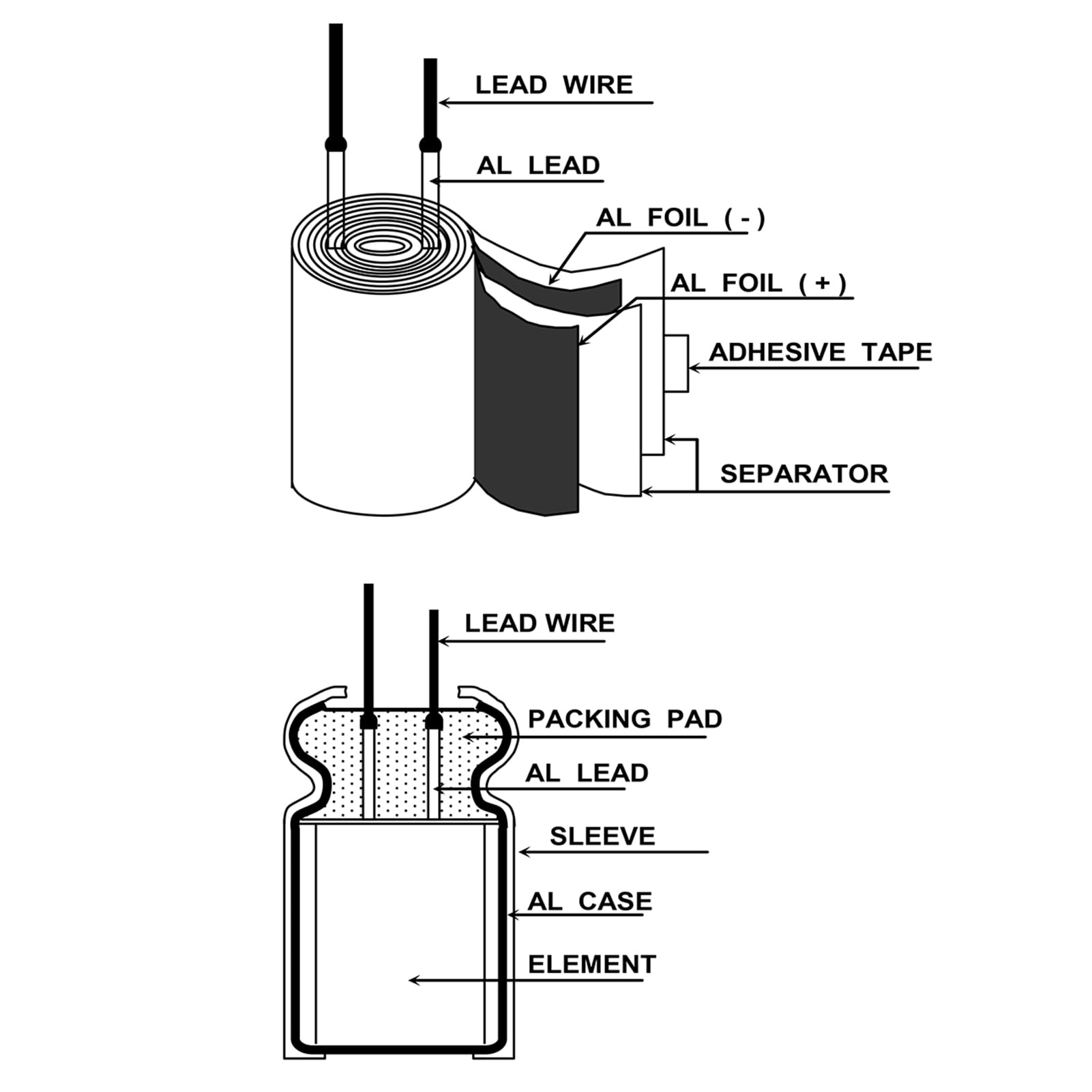 Dielectric material: aluminum electrolytic. Lead description: long lead = positive "+"; short lead = negative "-".