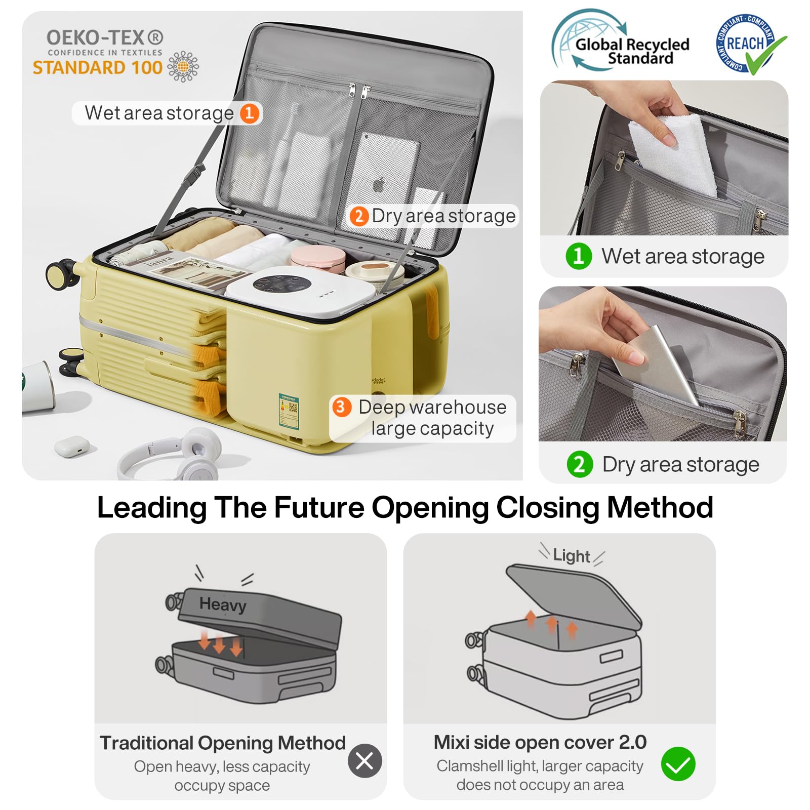 【One-Piece Side Opening Design】The design is different from the traditional way of opening and closing the suitcase in half, which is more convenient and less labor-saving. Mixi patent design, focus on luggage industry over 10 years, please believe Mixi brand power
