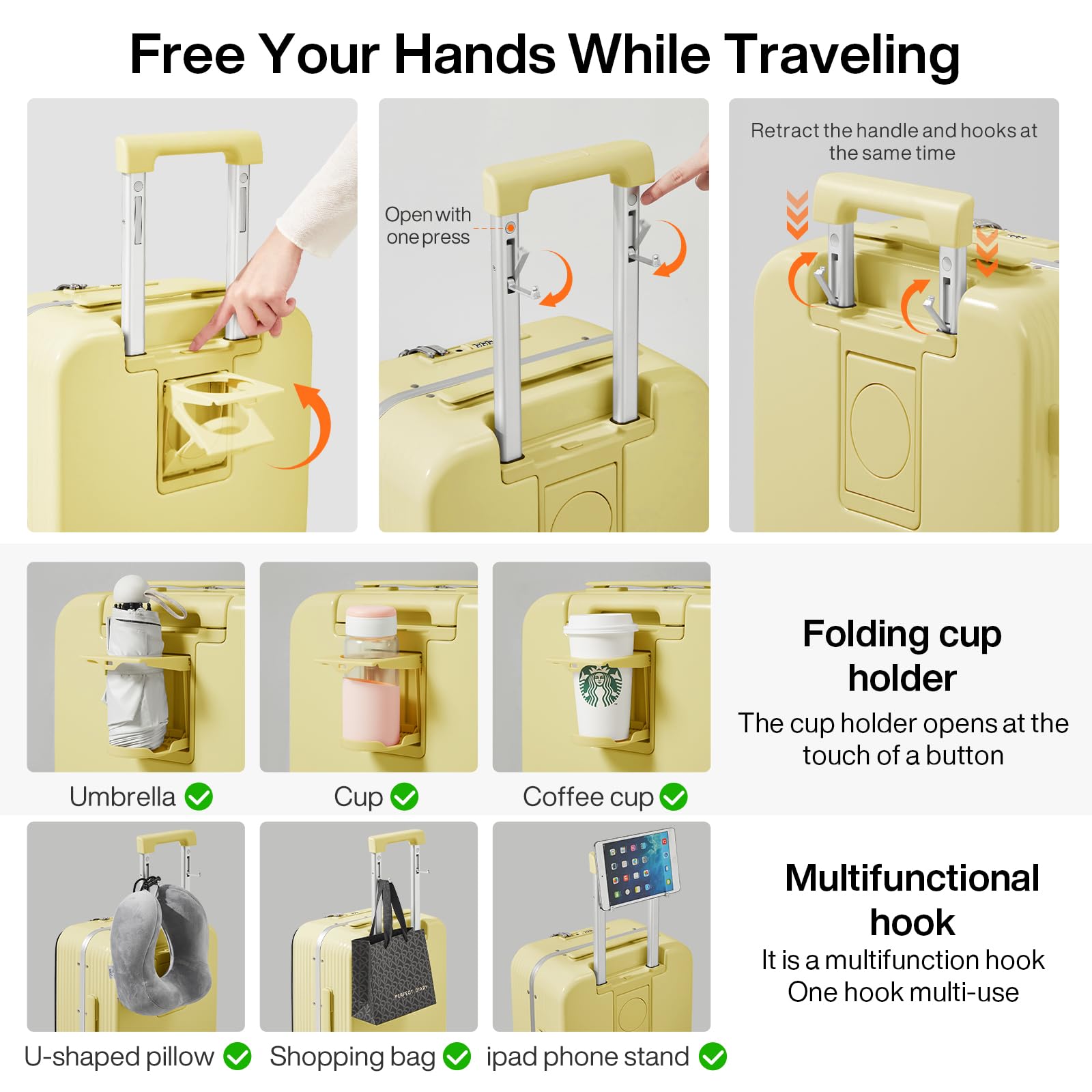 【Multifunctional Holder Design】Especially designed water cup holder, phone holder located in top of luggage and the handle hook. If you enjoy drinking coffee or playing with your phone while traveling, it will be the perfect choice