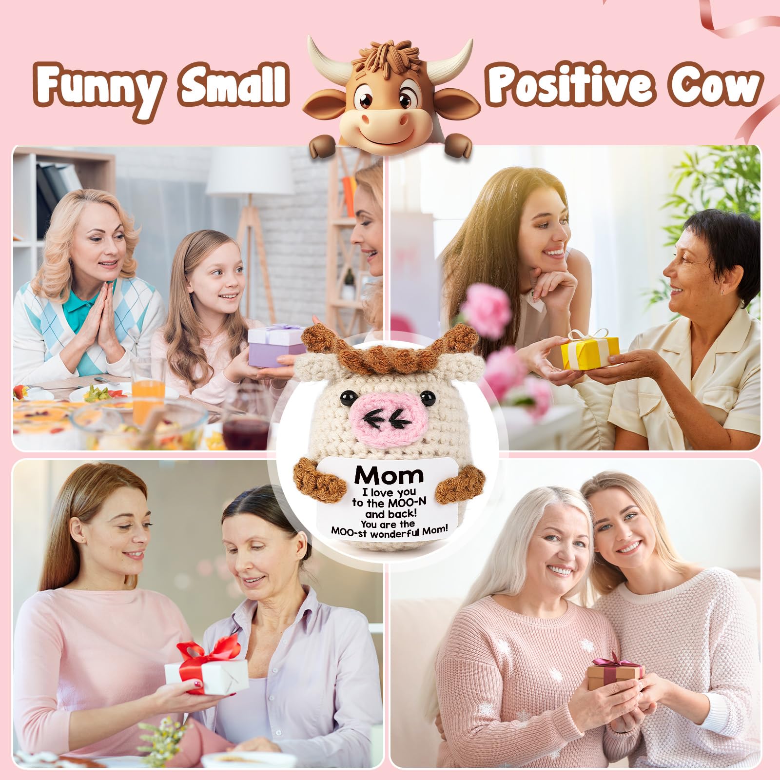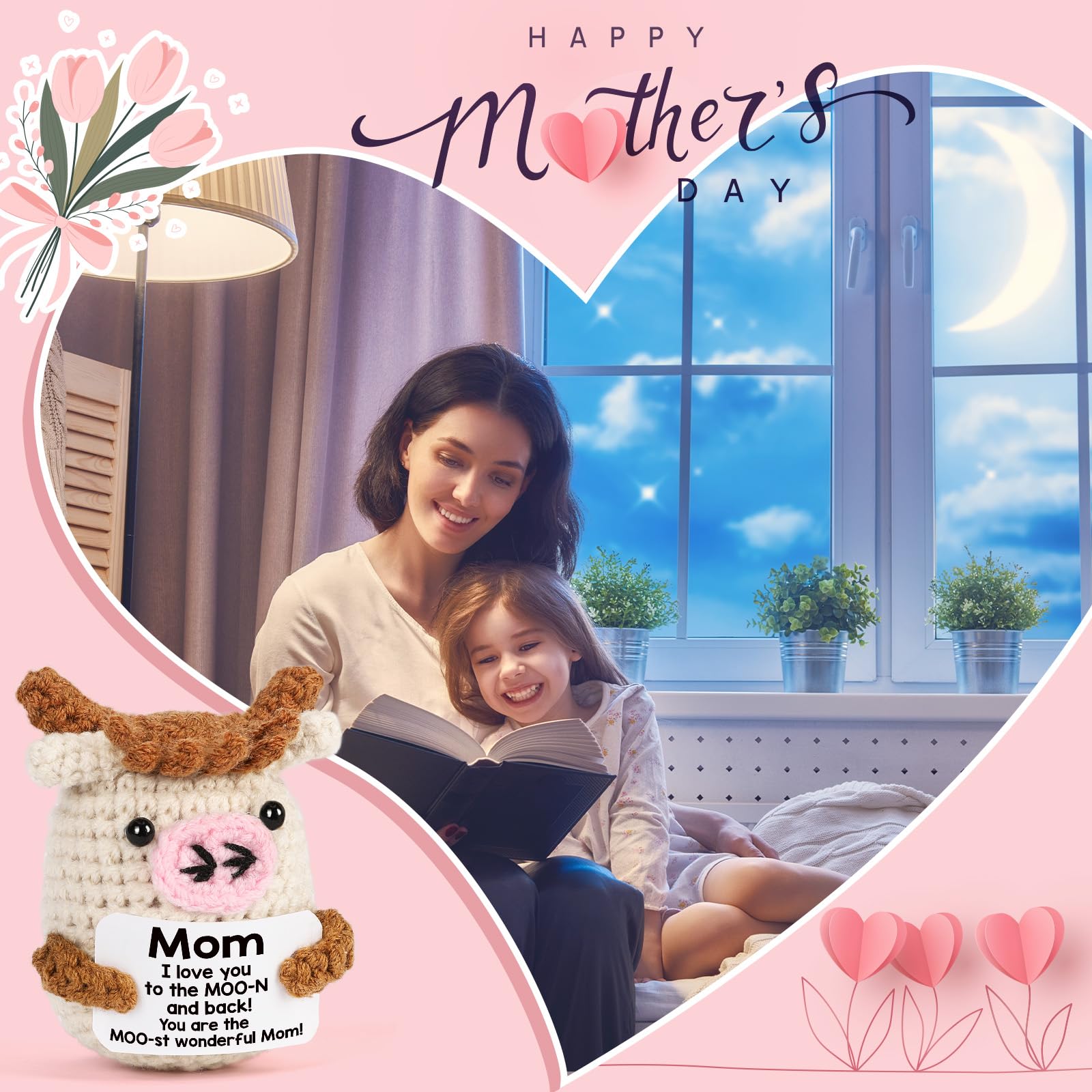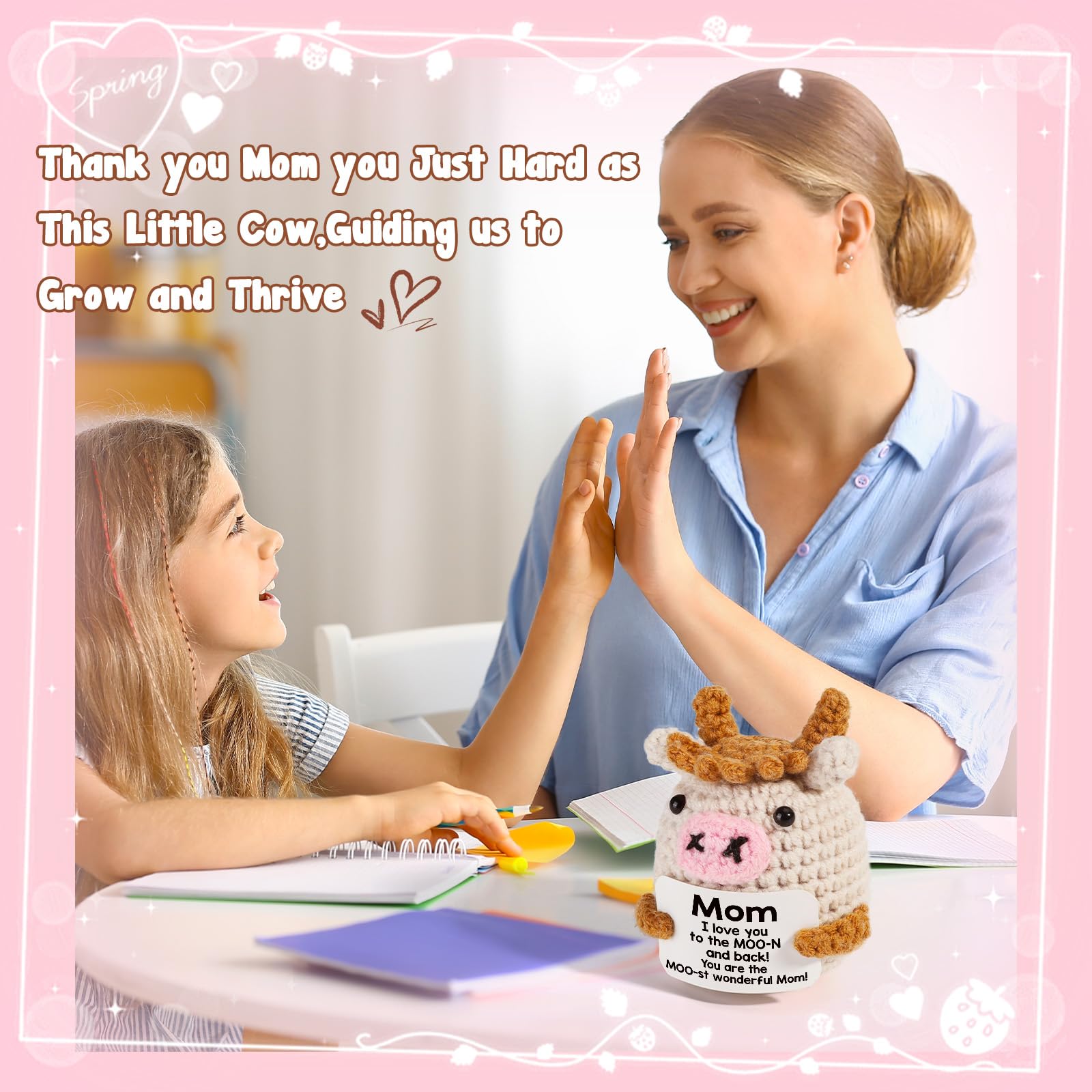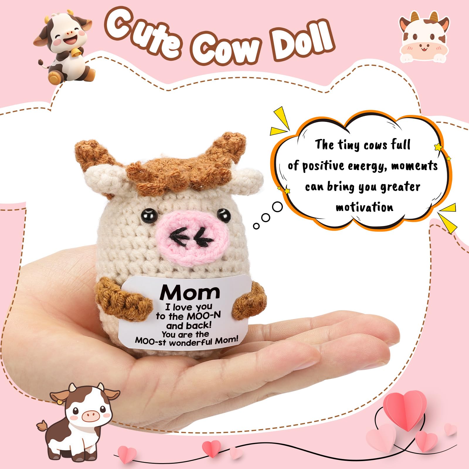 Mom Gifts for Mothers Day/Birthday: This handmade knitted cow doll with its playful message, “mom I love you to the moo-n and back! You are the moo-st wonderful mom!” is more than just a cute cow doll, is the perfect way to express love and affection to mom special