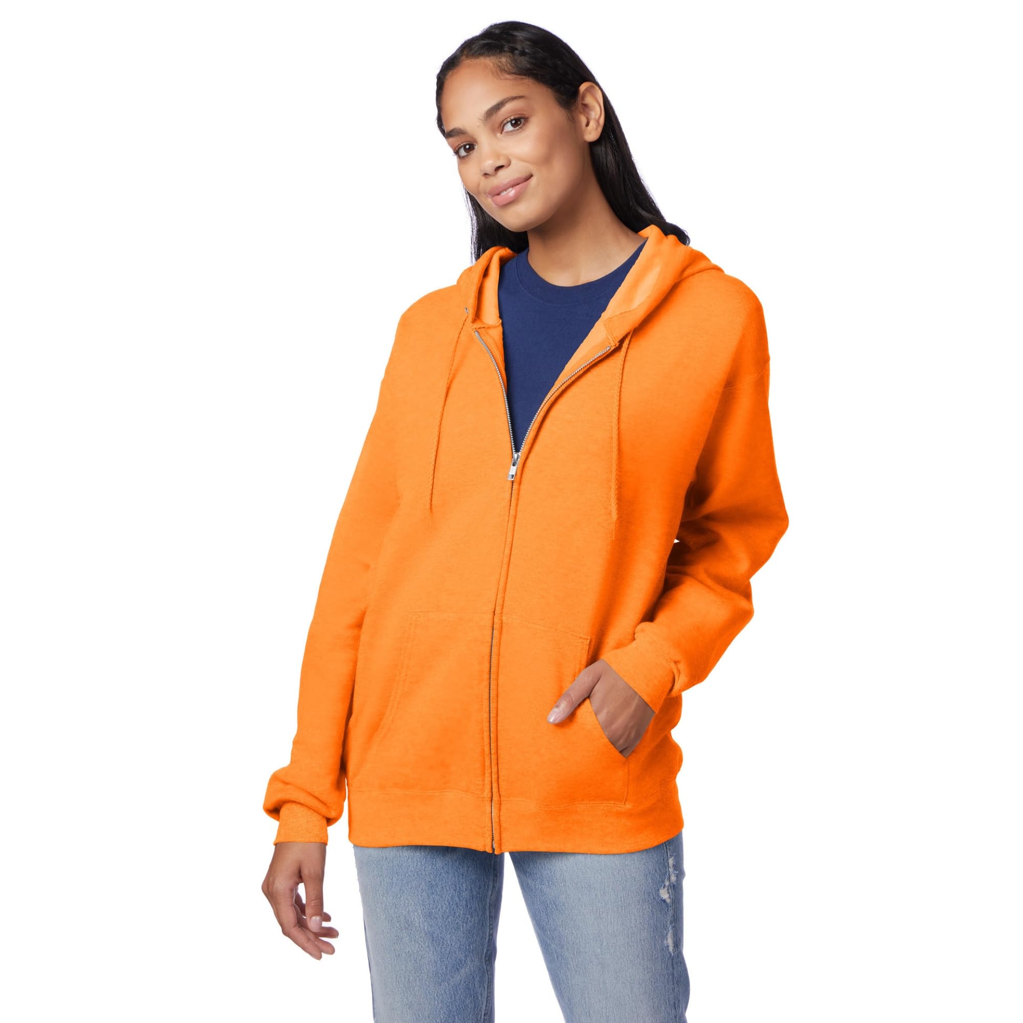 Description Hanes® EcoSmart® fleece is your new go-to wardrobe staple. Soft and plush, this cozy zip-up fleece hoodie is made of a midweight cotton/poly fleece blend that features cotton sourced from American farms. The fleece in this classic zip-front hooded jacket is incredibly soft, thick, and made to keep its warm, cozy feel. And it will hold its shape, thanks to ribbed cuffs and hem. Double-needle stitching at the neck and armhole seams further enhances quality and sturdiness. In classic hoodie style, there's a split kangaroo pocket and a dyed-to-match drawstring at the hood.