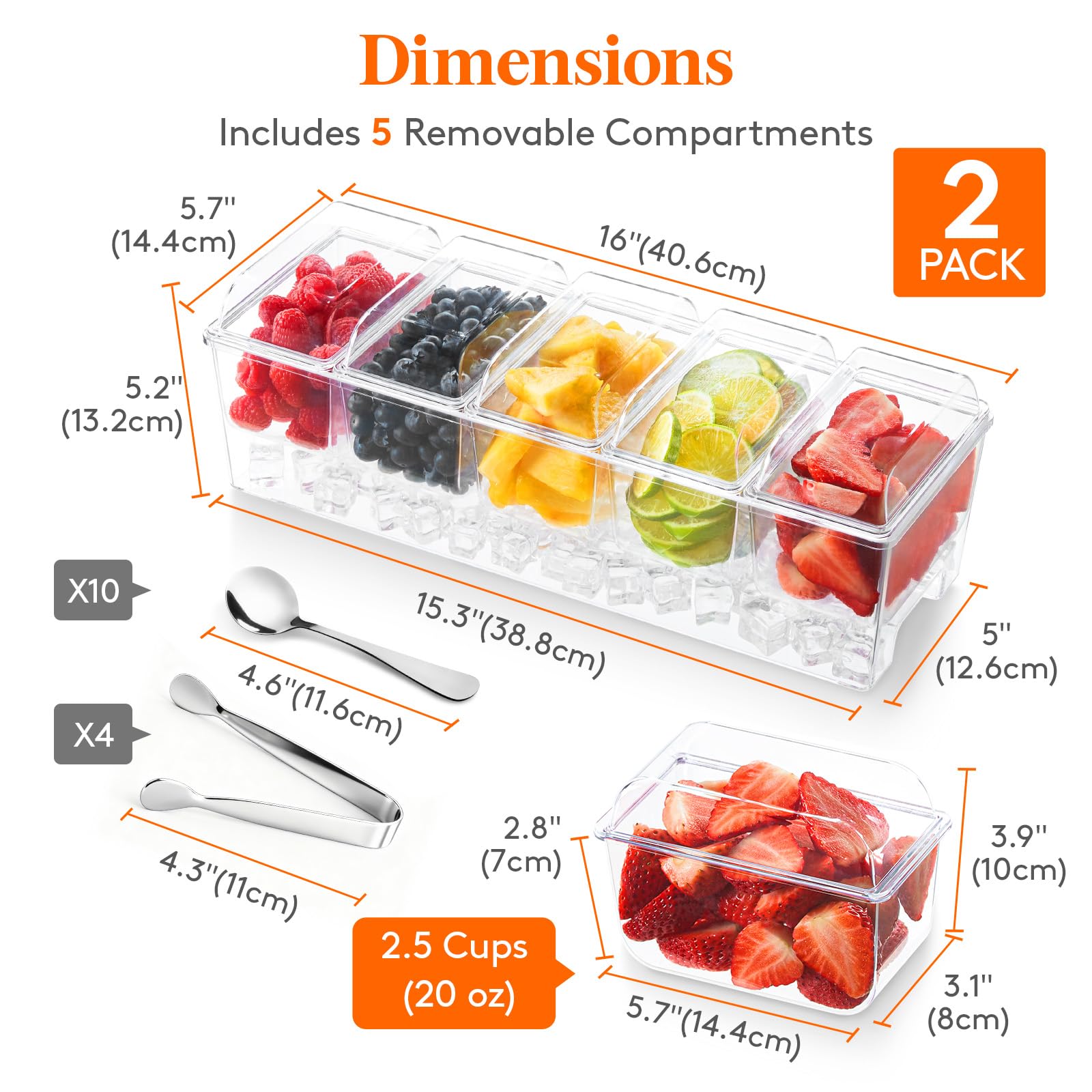 Large Capacity: The chilled serving tray measures 16" Γ 5.7" Γ 5.2" (40.6 Γ 14.4 Γ 13.2 cm) and comes with 5 removable compartments. Each compartment with a lid measures 5.7" Γ 3.1" Γ 3.9"(14.4 Γ 8 Γ 10 cm) and can hold approximately 2.5 cups (20 oz). The clever design allows for easy detachment and individual use of each compartment.