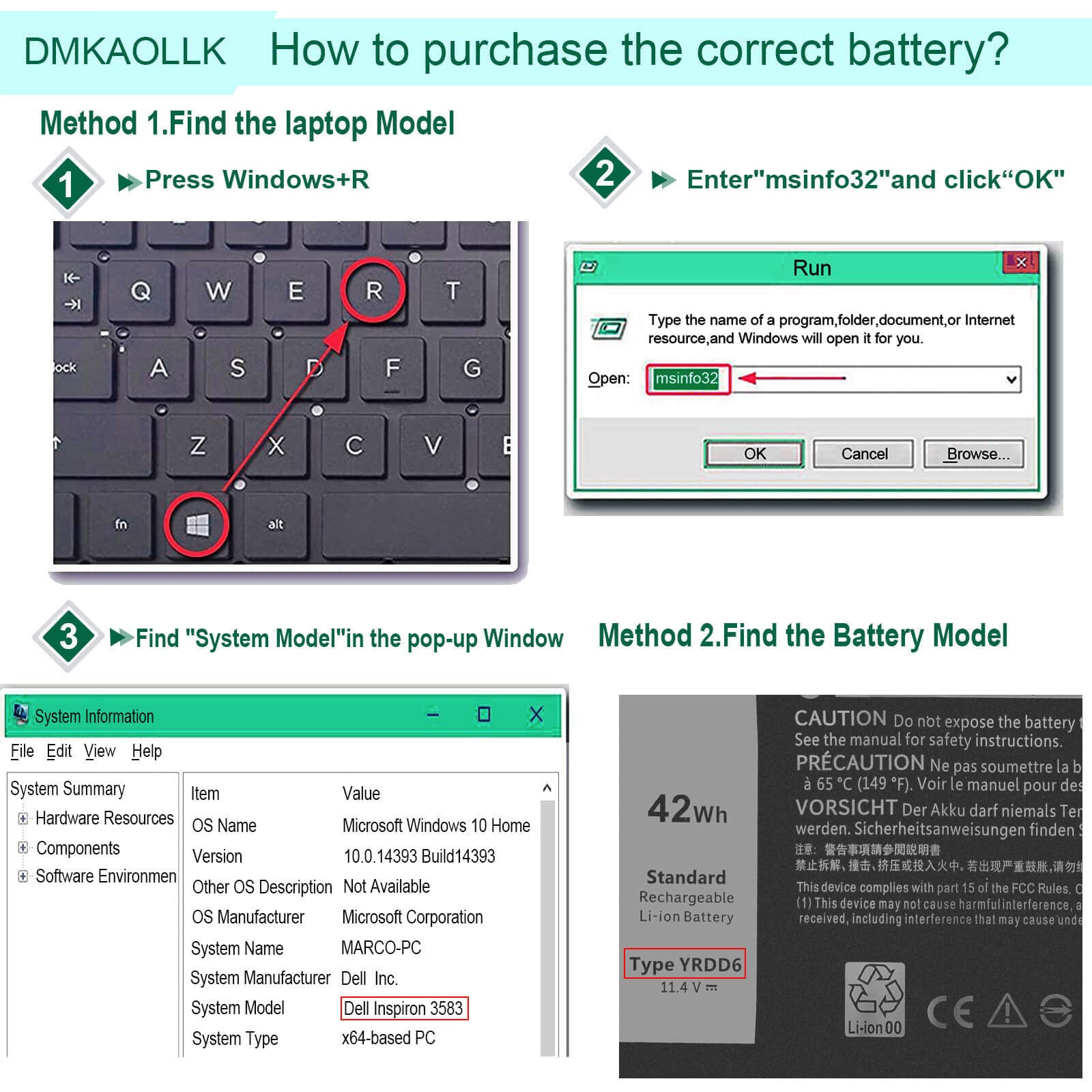Compatible Battery type: for Dell 42Wh Battery YRDD6 0YRDD6 VM732 0VM732 1VX1H 01VX1H 1VX1H96 P93G 8JF5PW2 P93G001 P75F, inspiron 3583 battery