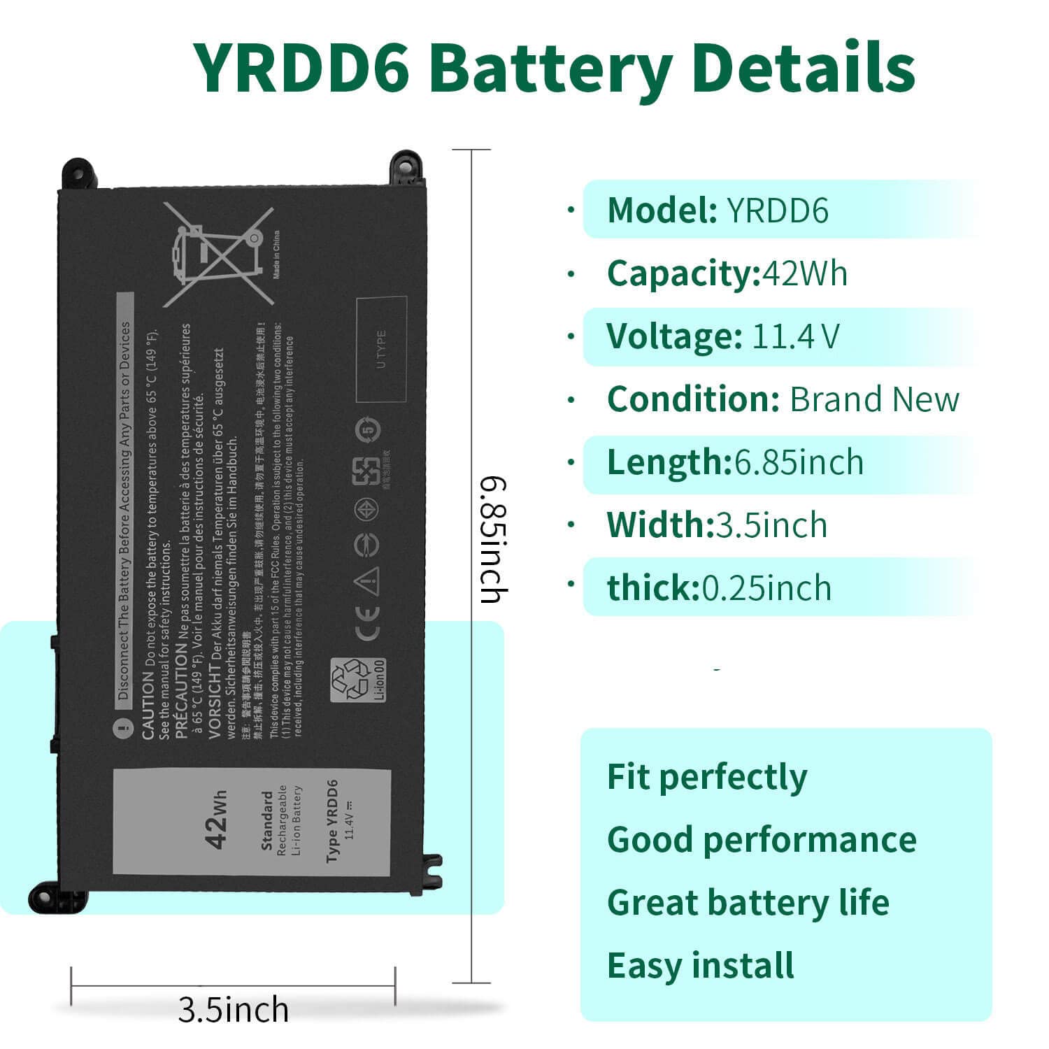 Specifications: Replacement battery for YRDD6 Battery Dell , Battery Model: 42Wh Standard Rechargeable Battery Type YRDD6 11.4V, Voltage: 11.4V Capacity: 42Wh ; Cells: 3-cell; Color: Black ,Packages includes: 1x YRDD6 Battery,2 x Free Screwdrivers(Easy to Install),1x Instruction for Laptop