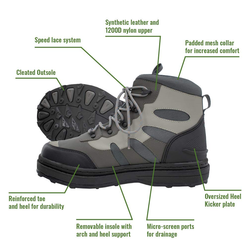 TRACTION ON SLIPPERY SURFACES - because falling and losing your gear is not fun. Felt soles with recessed stud attachment points allow you to navigate your favorite fishing spot or explore new ones