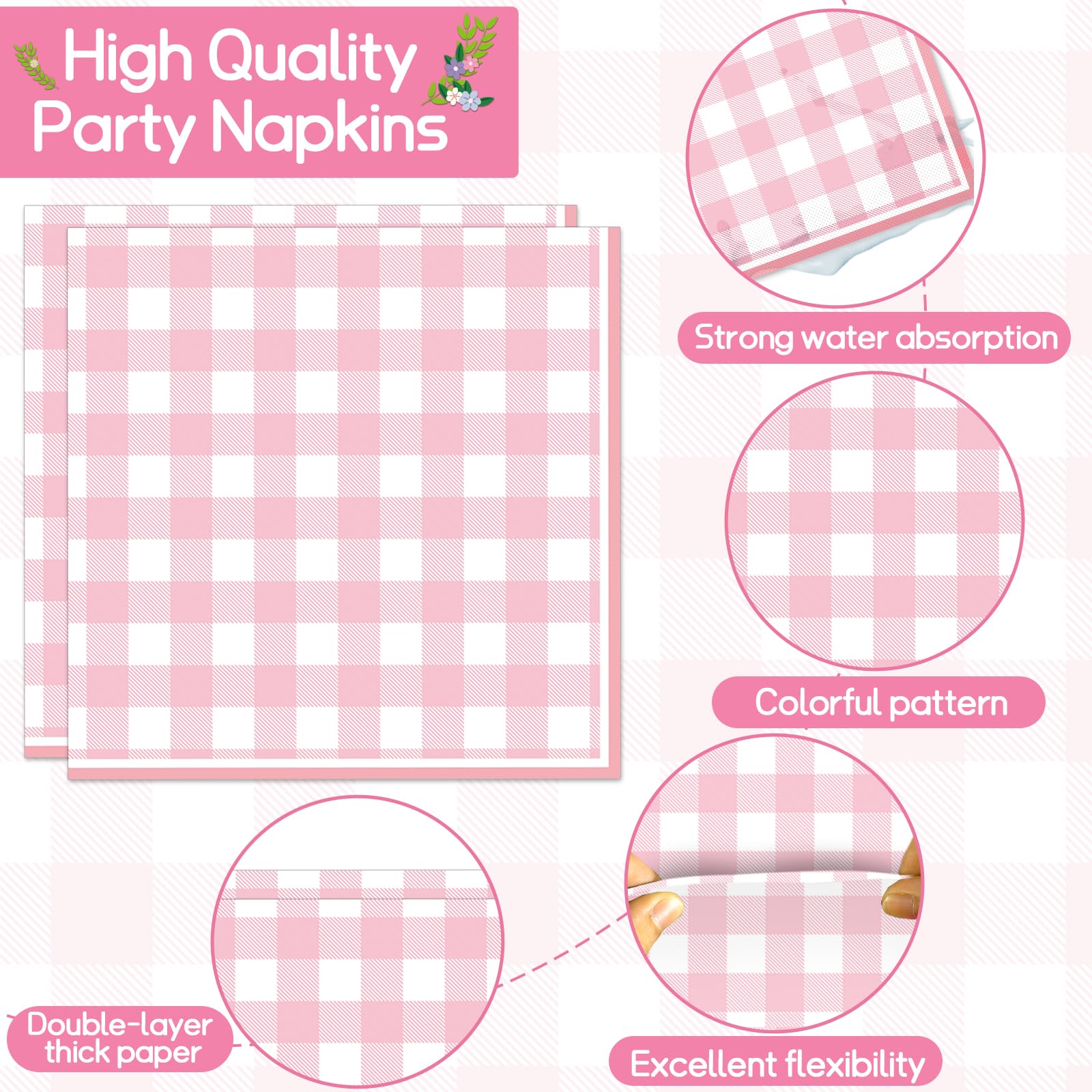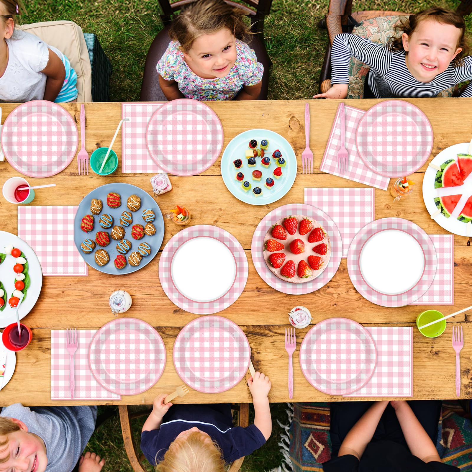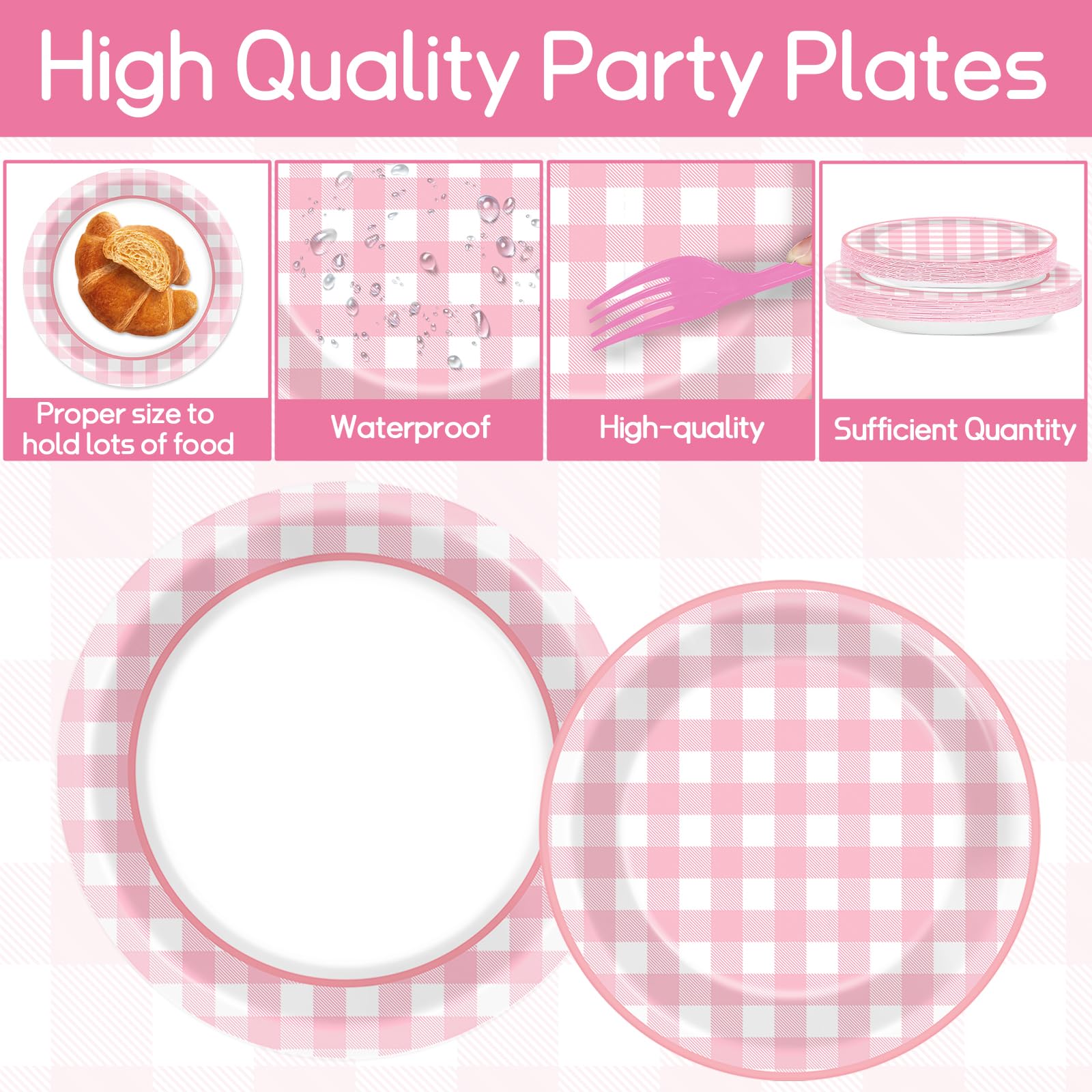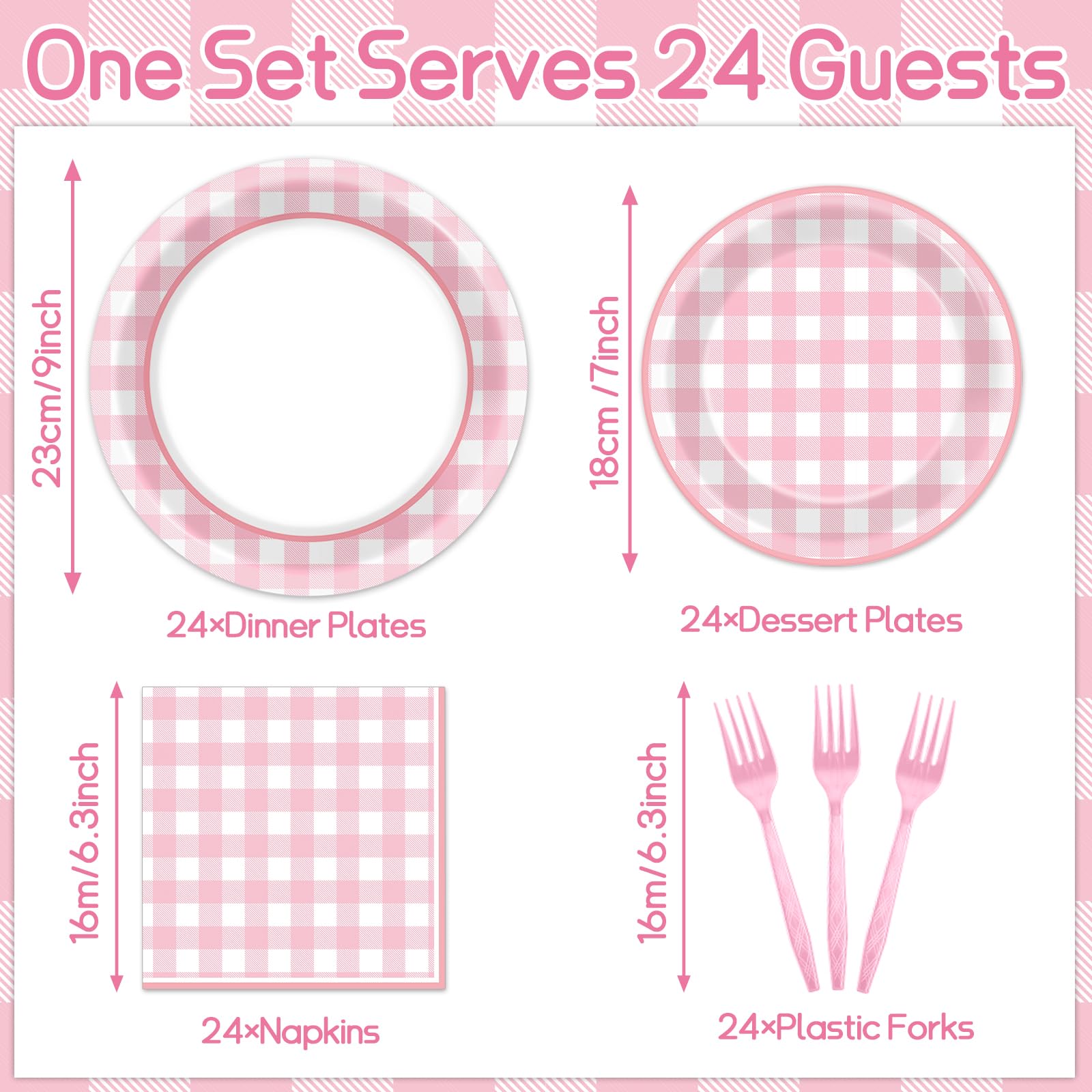 Packing content: These pink and white gingham checkered plaid party tableware includes: 24 dinner plates (9 inch), 24 dessert plates (7 inch), 24 napkins (13 inch) and 24 forks, there is a total of 96 pieces in this set, which will suitable for 24 guests in your picnic birthday party.