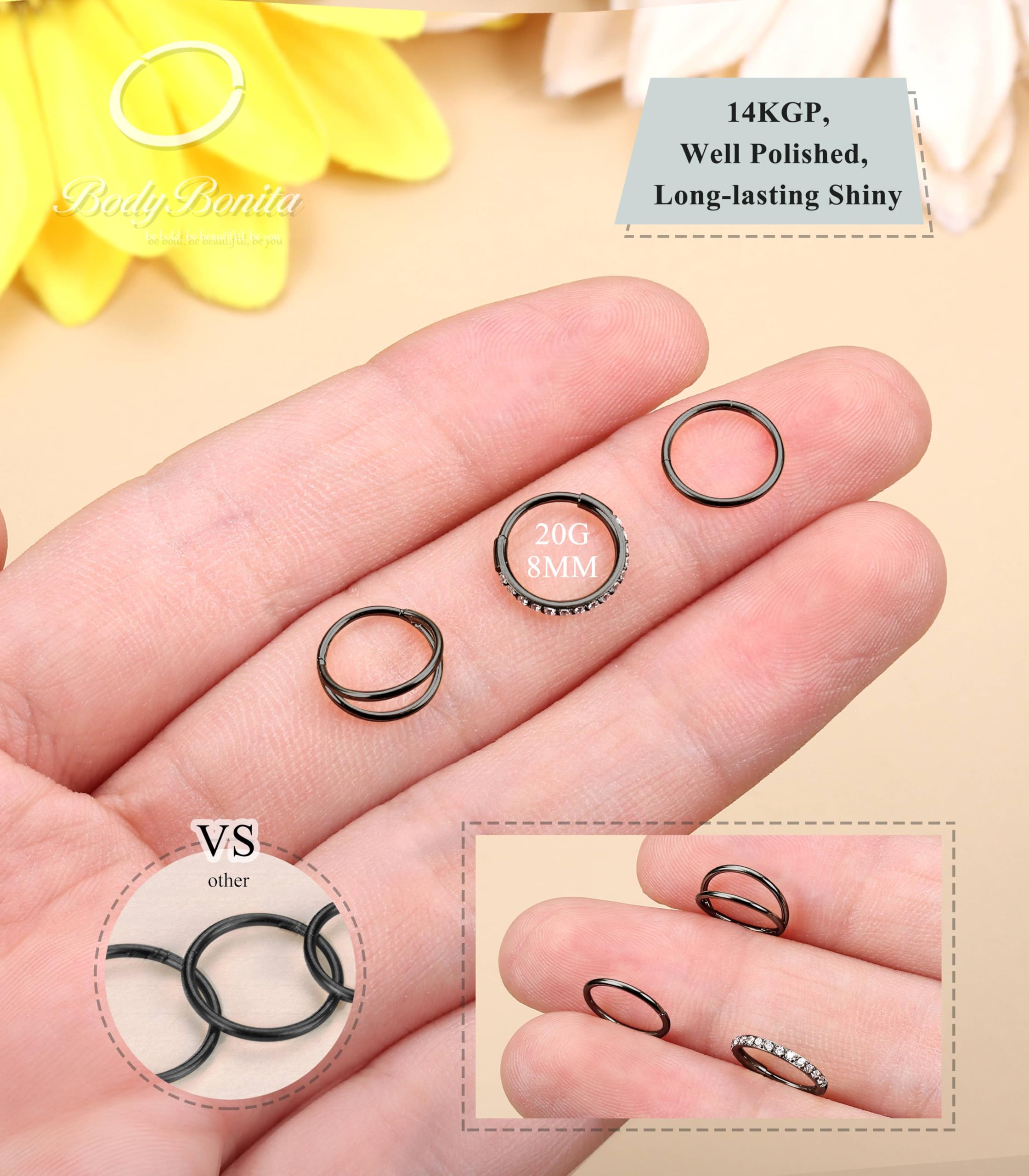 Description What you get: 3 pcs of BodyBonita seamless nose ring(14K gold plated/silver/black plated/rose gold plated ), crafted to be brilliantly shiny, hypoallergenic, and effortlessly easy to put in and take out. Materials: 316L stainless steel. Style in One Package: cubic zirconia nose hoop, double nose ring hoop, classic single nose rings hoop. Available Color: 14K gold plated/silver/black plated/rose gold plated. Avaliable Gauges Size: 14g, 16g, 18g, 20g. Avaliable Inner Diameter : 7mm, 8mm, 9mm, 10mm. Product Types: Lip piercing/aretes para labios, Septum ring, Hoop belly button rings, Cartilage earring, Daith piercing jewelry, Conch hoop earring, Helix earring, Tragus earring, Rook earrings, Acero inocidable dorado arete percing, Nipple rings.