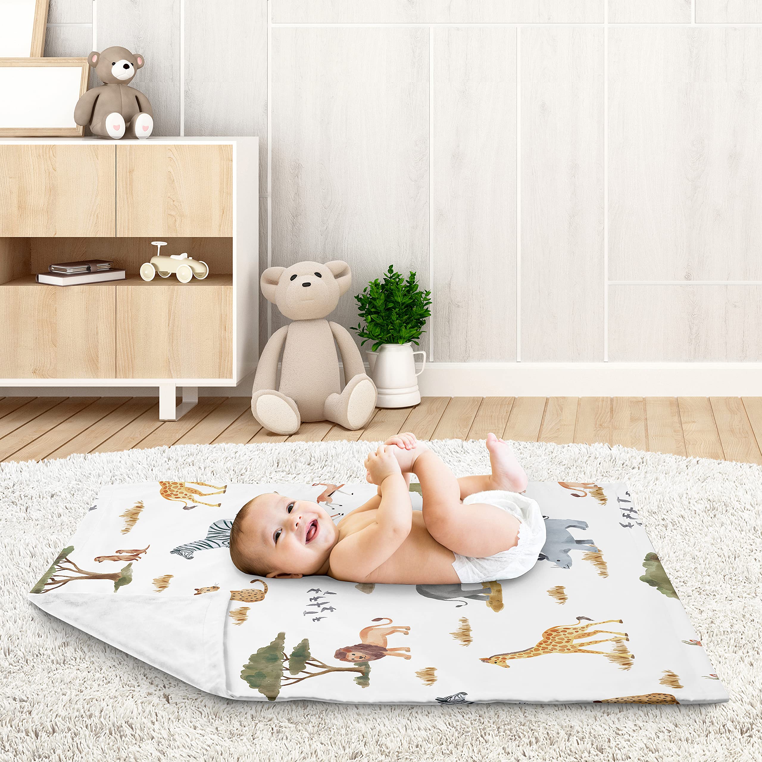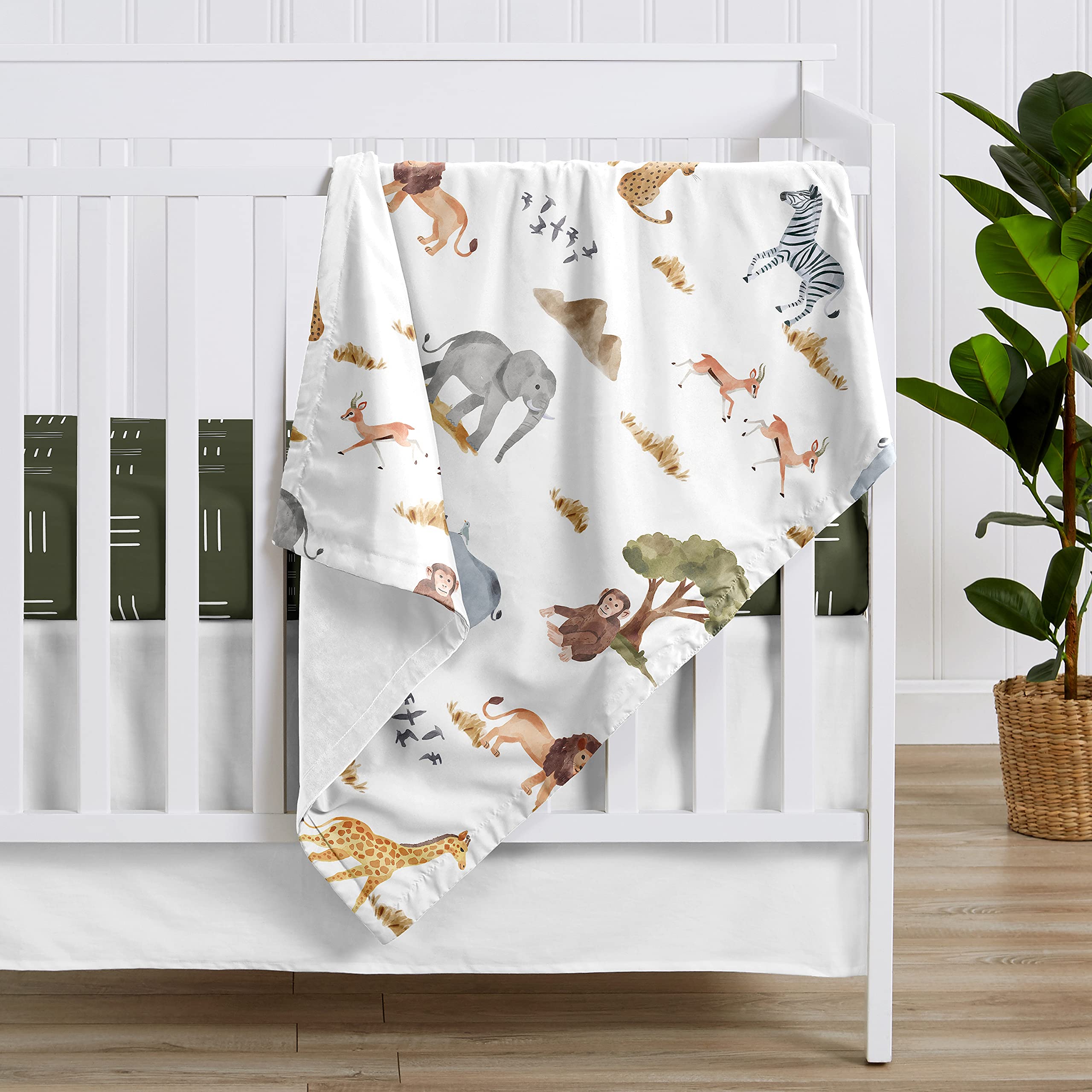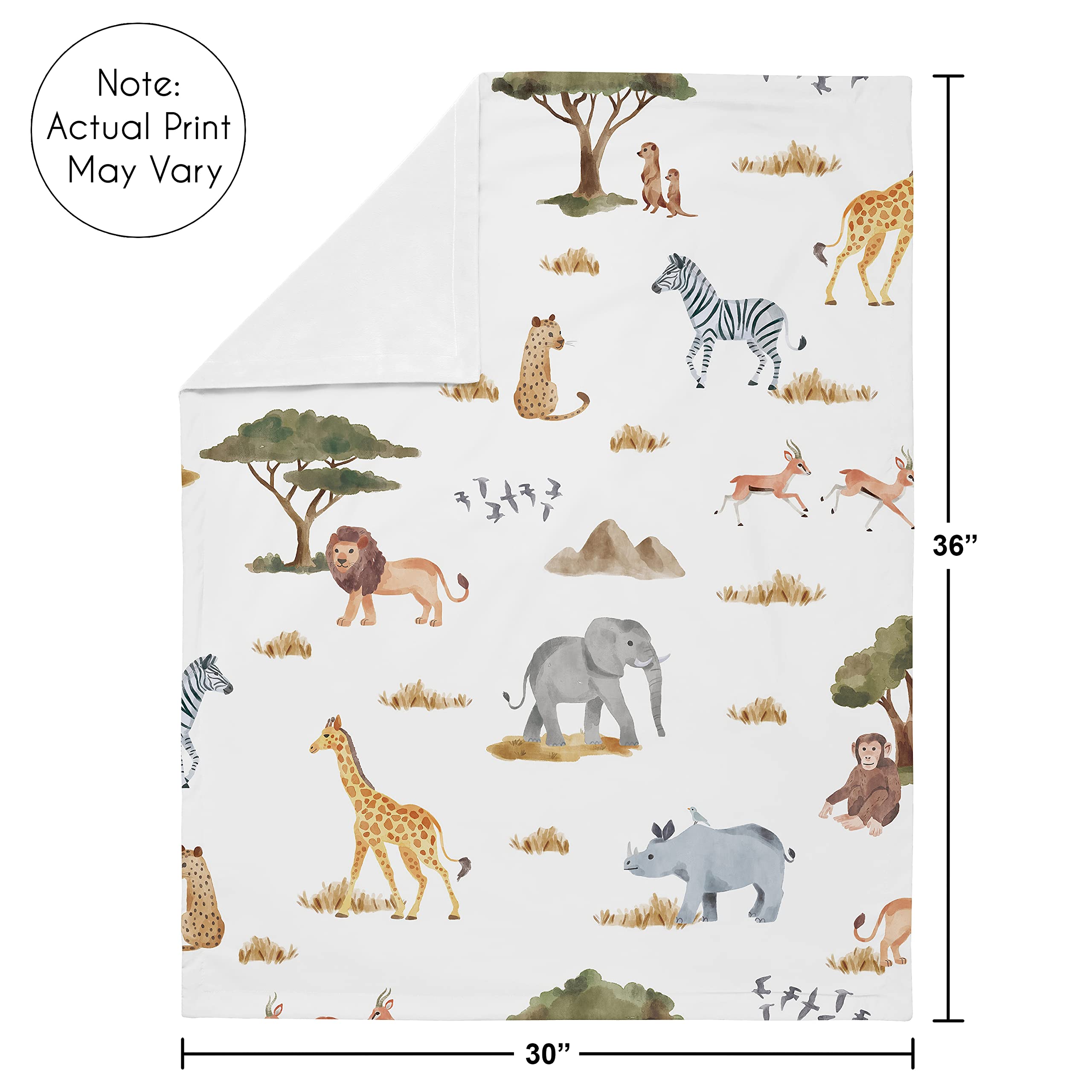 Blanket is designed using a multicolor watercolor jungle animals brushed microfiber print and reverses to soft white minky