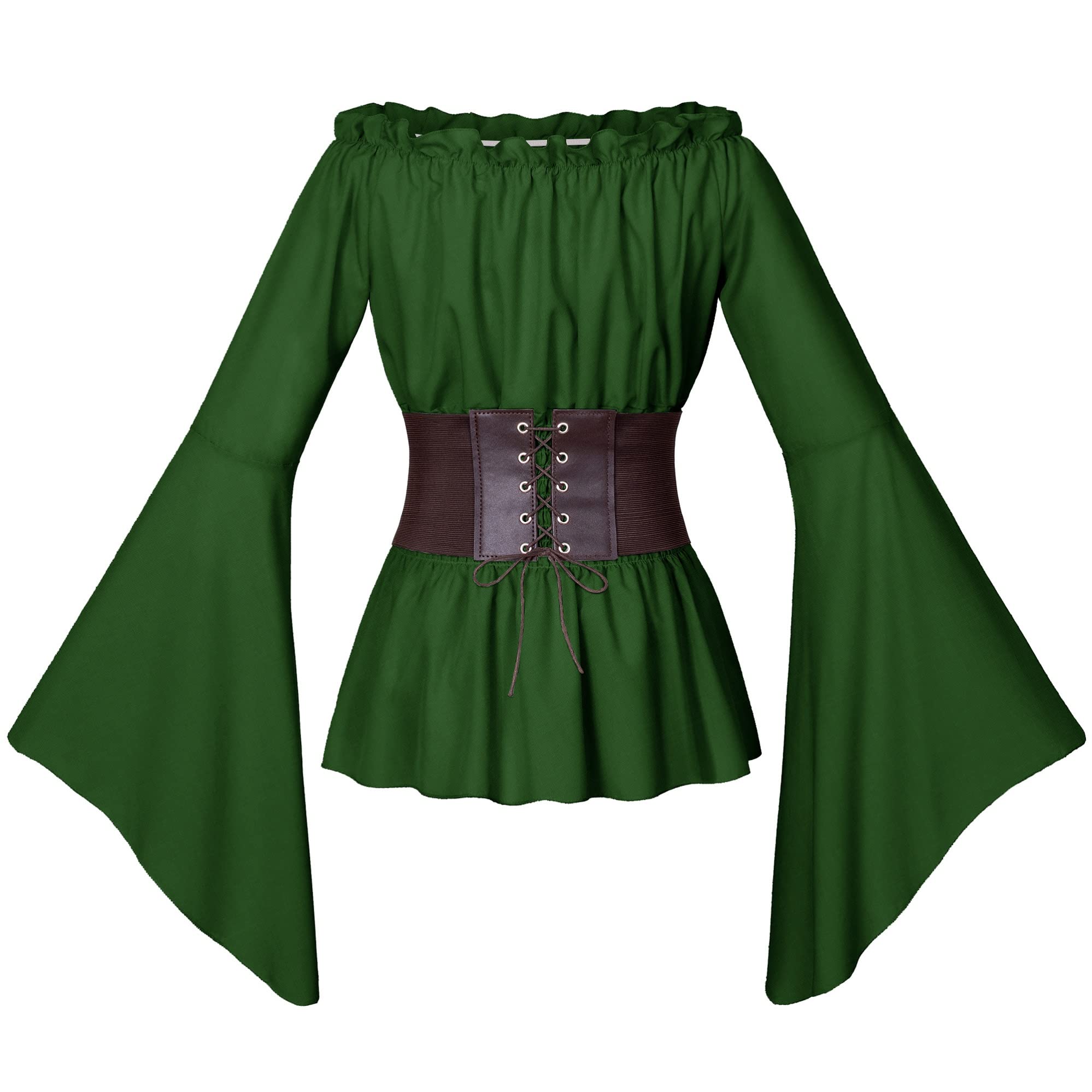 Material: 97%polyester 3%spandex,well made, soft and comfortable to wear, renaissance sexy off shoulder top blouse shirt.The PU leather belt is fastened with a drawstring to fit your waist better.