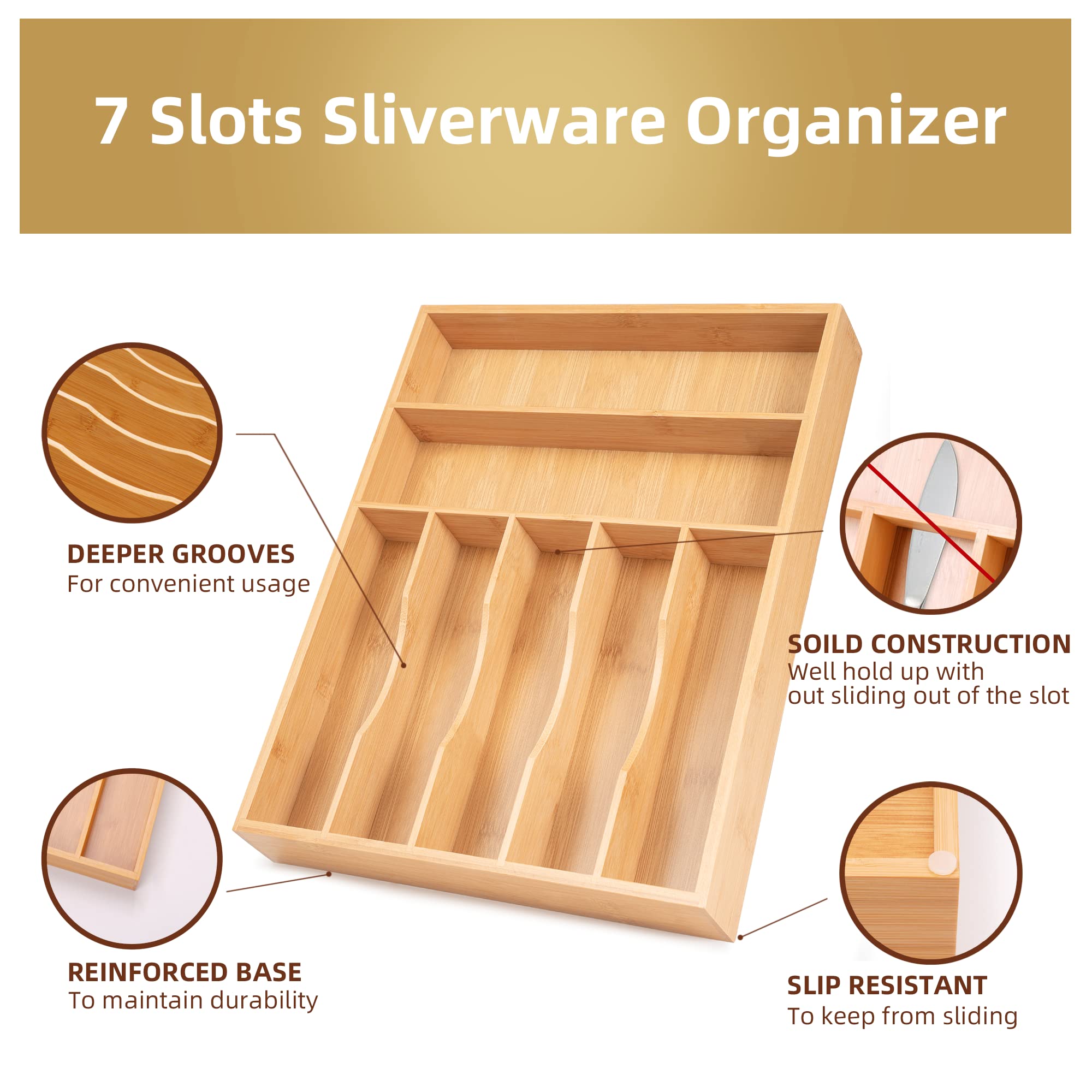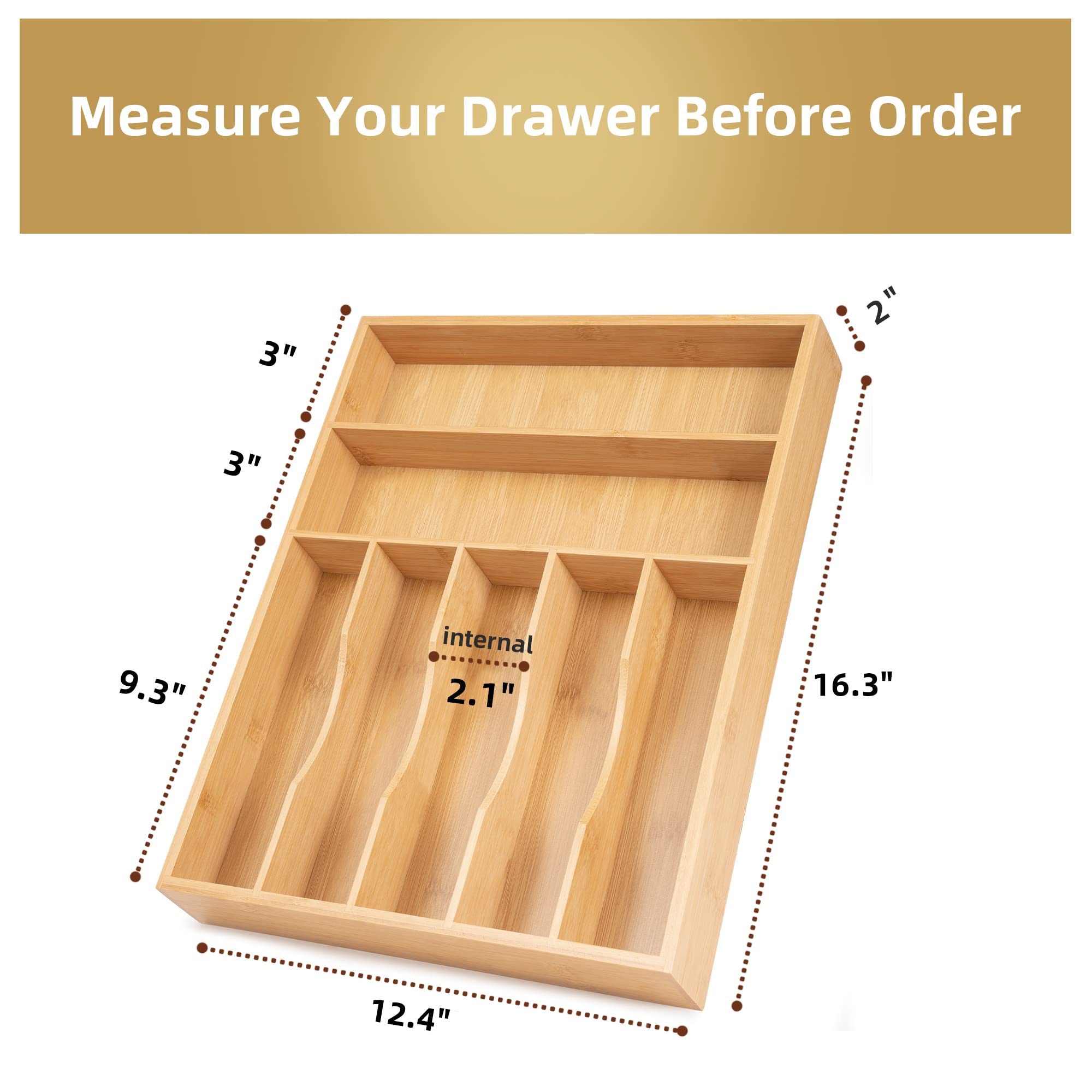 【Keep Your Home Tidy】This beautiful 7-compartments cutlery organizer has 2" deep compartments and can be placed into any drawer or desktop, which helps you to see everything at a glance and keep away from messy. The perfect space-saving silverware organizer helps you to reach the desired item that you are looking for. Whether you are looking for your favorite knife or spoon, this utensil organizer makes it completely simple and easy. We highly recommend to measure your drawer before order.