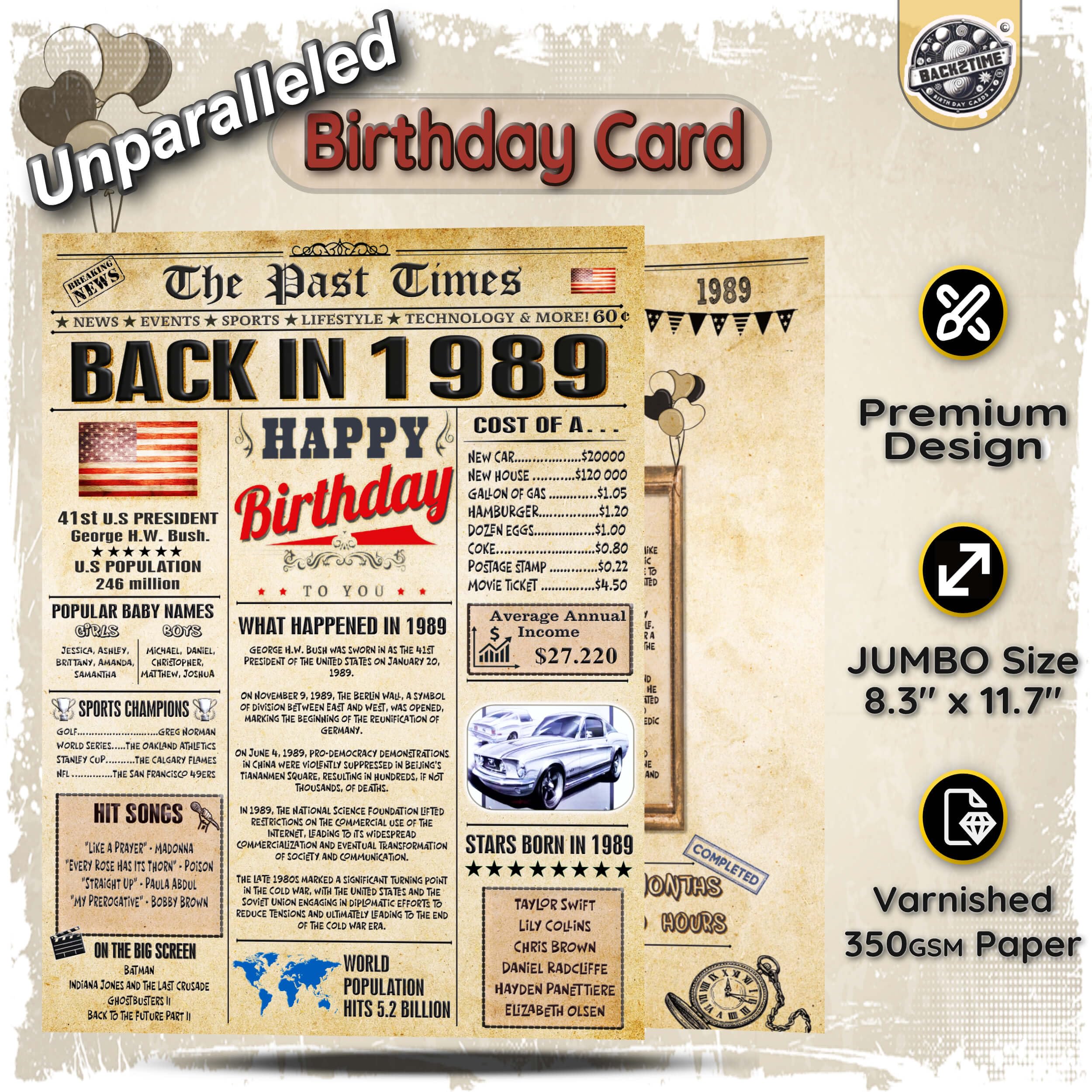 ๐ FUNNY BIRTHDAY CARD + EXCLUSIVE ENVELOPE ๐ Enjoy a beautifully printed Back in card that's entertaining to read, featuring a special bonus on the back with intriguing stories or lesser-known facts from that year. The interior offers space for personalized messages, designed with an aged appearance and elegant decorations to enhance the vintage feel. The included envelope boasts a unique design ideal for mom and adult born in 1989. Birthday Cards for Women, Birthday Cards for Men.