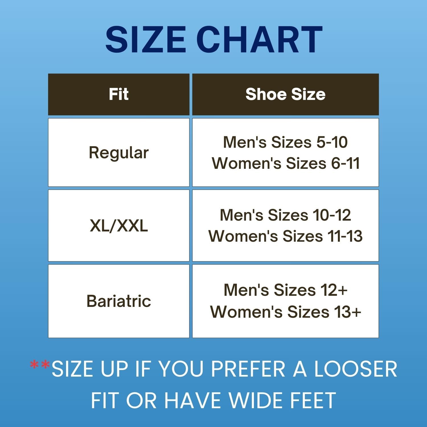 X-Large Fit: Men's size 10-12. Women's size 11-13. **If you have wide or swollen feet, we recommend sizing up.