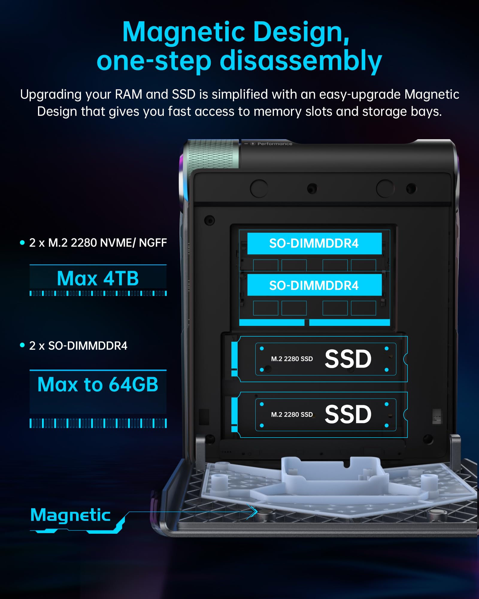 [32GB Dual Channel DDR4 & 1TB M.2 SSD] With up to 32GB of DDR4 RAM and 2x M.2 SSDs to accelerate load times and nearly double the throughput of a single drive, you can upgrade your Mini PC to a maximum of 64GB (2x32GB) of dual-channel DDR RAM and NVME/NGFF SSDs up to 4TB (2x2TB). With up to 1TB of storage space, you can have your favorite games ready to rock n' roll!