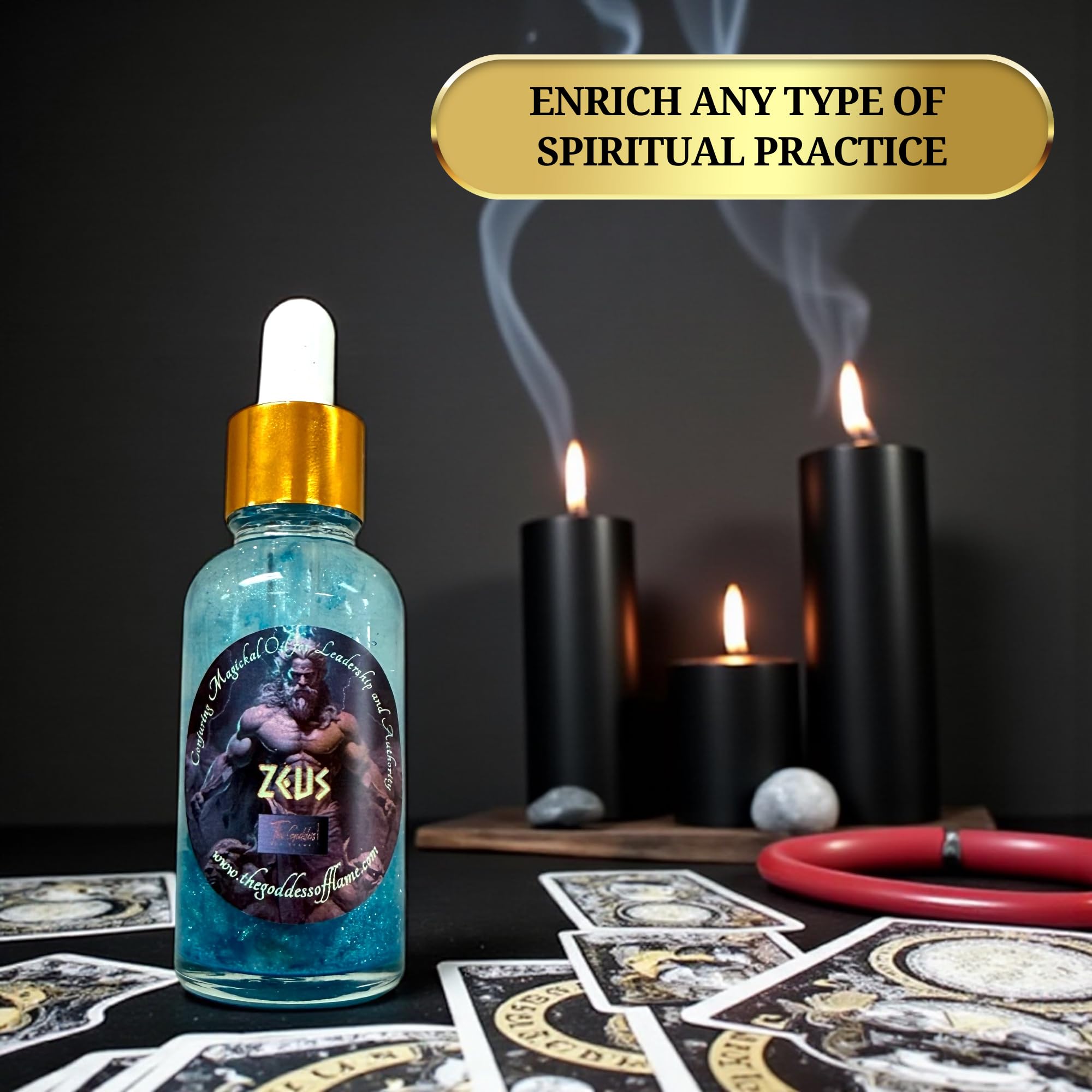 Command your destiny with The Goddess of Flame Zeus Oil, a ritual blend infused with the power of the Greek God of Sky and Thunder. This anointing oil embodies strength, confidence, and divine authority, helping you manifest success, protection and unwavering will. Use Zeus Oil to anoint candles, tools or yourself before rituals, meetings or spiritual work to invoke courage and assertive energy. Every bottle is ritually charged to align you with divine masculine power, protection and leadership — the essence of Zeus himself. Perfect for those working with Greek deities, or seeking to balance confidence and clarity in spiritual practice.