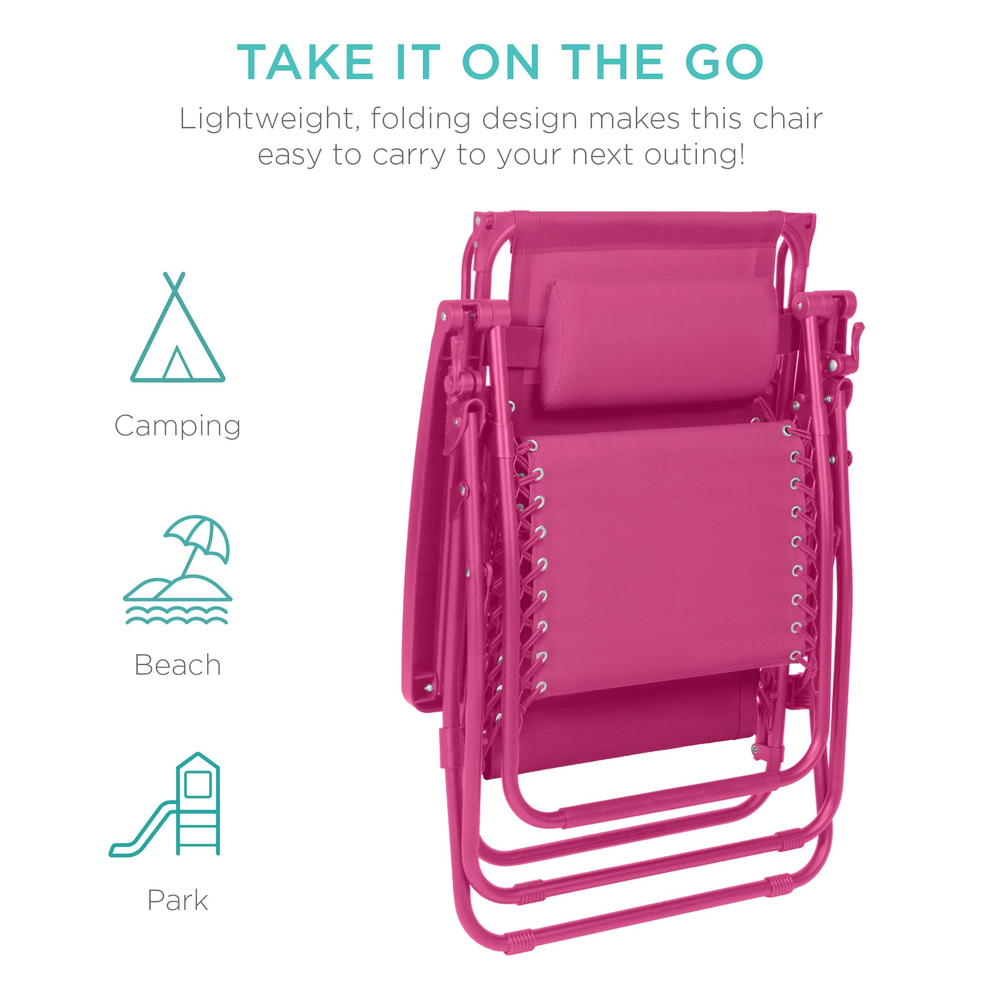 TAKE IT ON THE GO: A lightweight, folding design makes this chair easy to enjoy at home, the beach, the park, or your next tailgate; OPEN DIMENSIONS: 34"(L) x 27"(W) x 49"(H); FOLDED DIMENSIONS: 27"(L) x 7.5"(W) x 37.5"(H); WEIGHT CAPACITY: 250lbs.