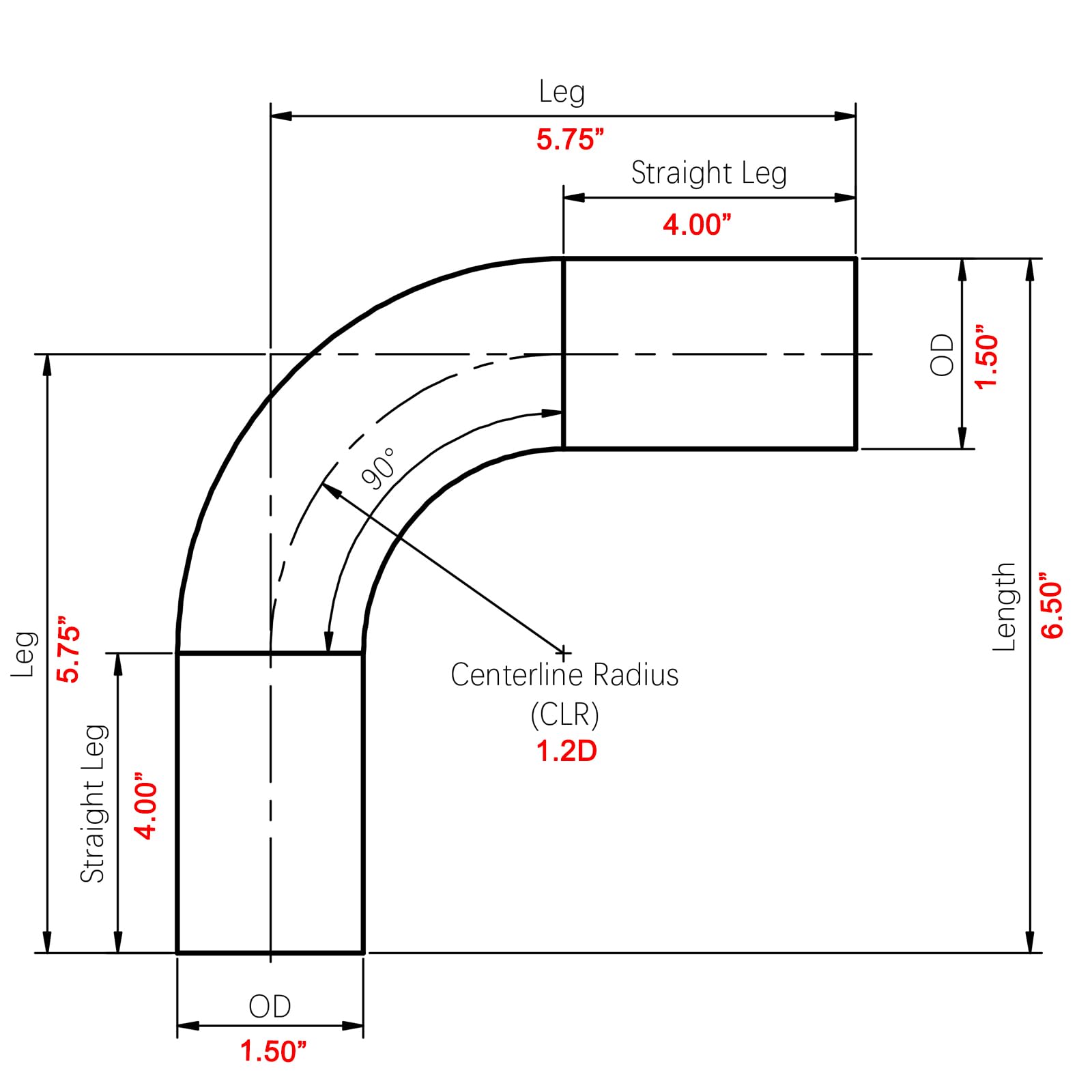 90 Degree bend, outside diameter: 1.5" (38mm), Leg Length: 4" (100mm), wall thickness: 0.059" (1.5mm)