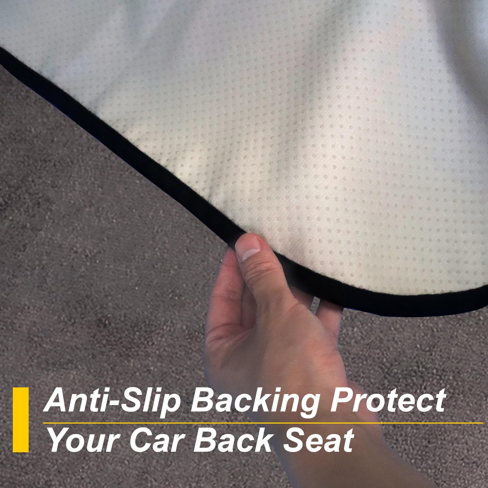 Made From 3 Layer Material: (Front) Grey towel cloth material, which gives the rear seat cover a good look and a super long life. It is perfect for leather or upholstery back seats. (Middle) Waterproof fabric that is designed to guard your backseat against moisture and sweat. (Back) This rear seat cover are designed with a non-slip backing fabric that's super comfortable and won't slip off your back seat.