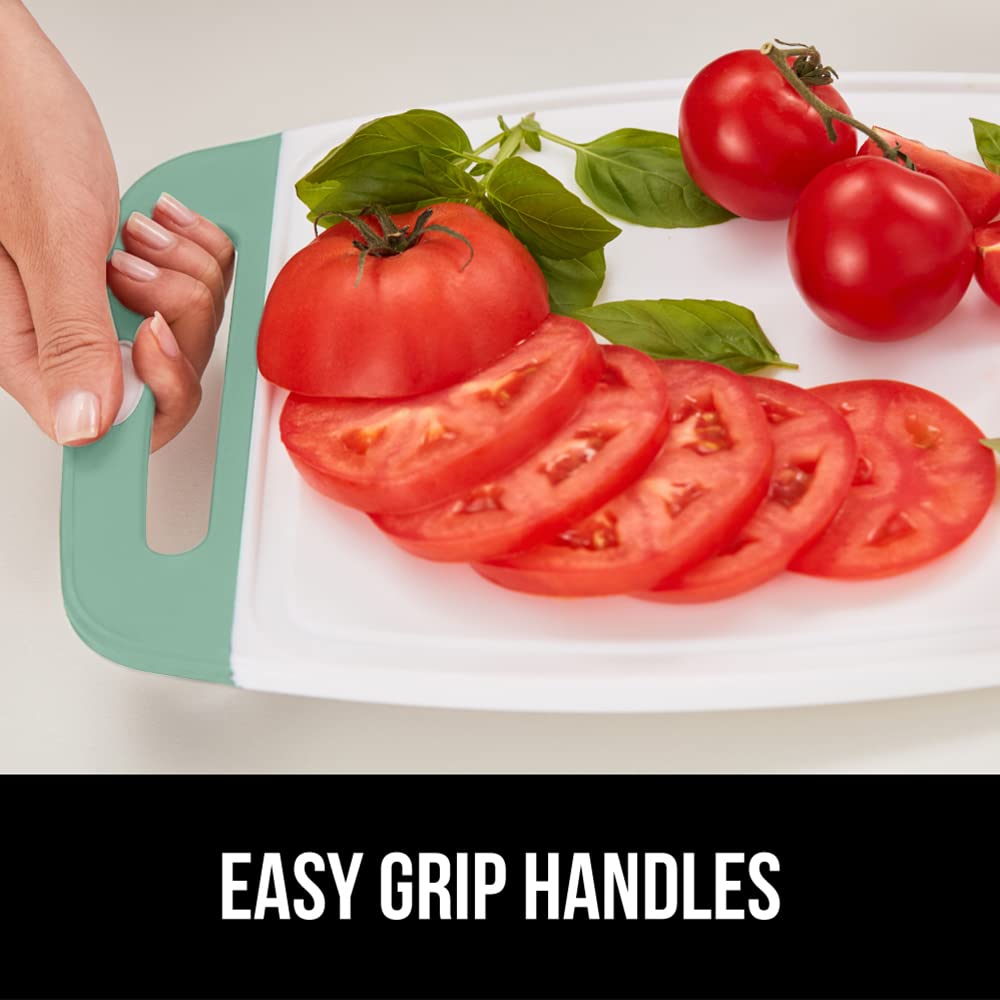 STAYS IN PLACE DURING PREP: make food prep easier than ever with the most durable cutting board; its slip resistant handle and rubber border help to reduce slipping and sliding on countertop surfaces