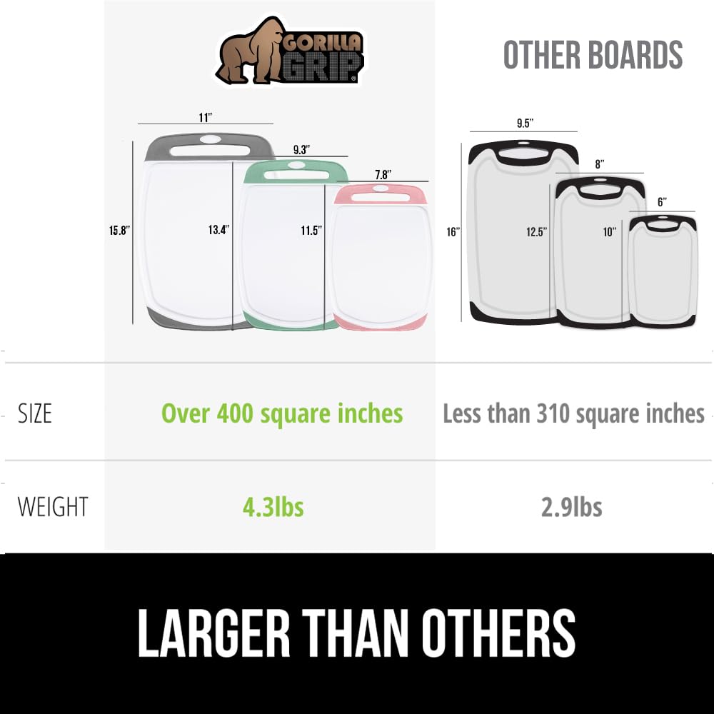 LARGER THAN OTHERS: 3 generously sized boards are extra thick; largest board measures 15.8 by 11 inches; medium board measures 13.4 by 9.3 inches; small board measures 11.5 by 7.8 inches; each board is .3 inches thick and combined, weigh 3.6 pounds; other boards are just .2 inches thick and weigh as little as 2.9 pounds