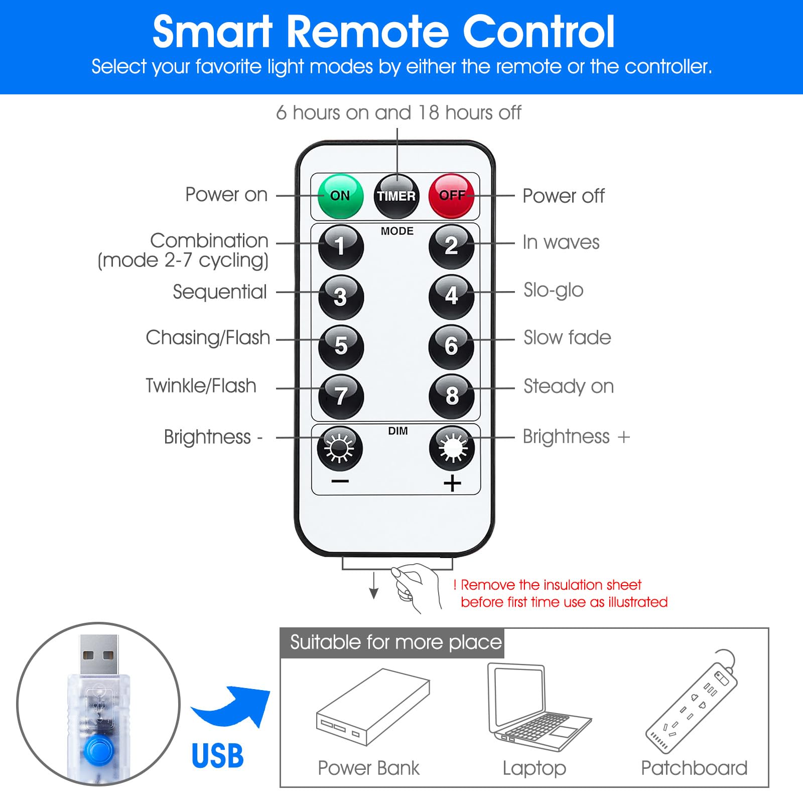 ✨8 Modes & Memory Function - The string lights have 8 lighting modes: Combination, in waves, sequential, slogs, chasing, slow fade, twinkle, steady on. With a memory function, the mode that is turned on again after being turned off is that before turning off.