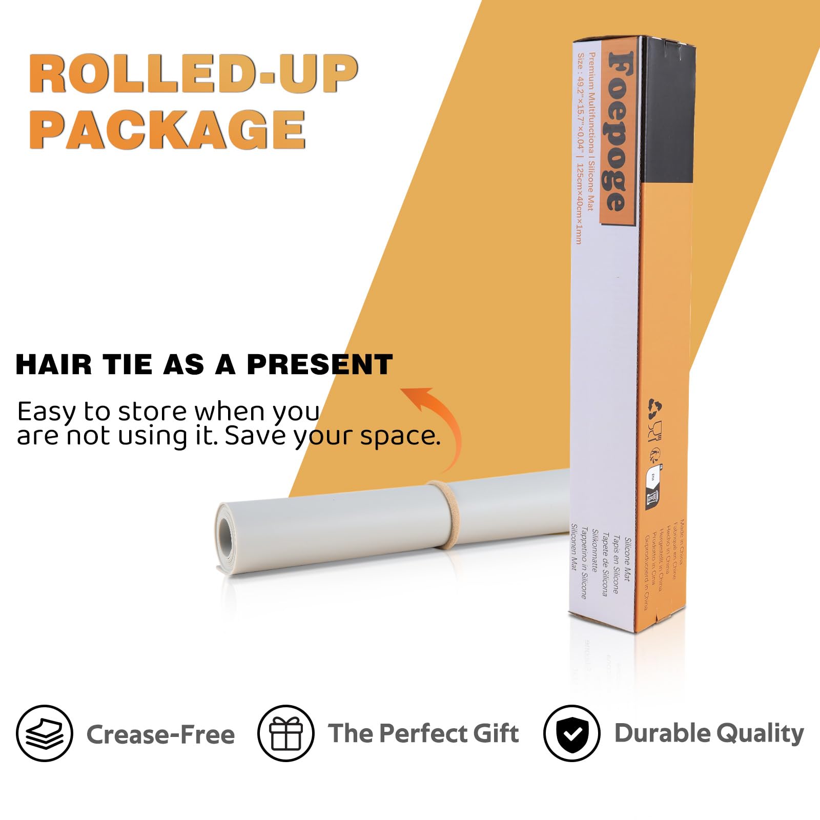 Packed on a roll: This silicone countertop protector mat is packaged in a roll, can fit nicely on the countertop, no need worry about the crease. Stylish packaging is a good choice for present, each package attached a hair tie as a present. You can use the hair tie to conveniently store the countertop mat and save your space.