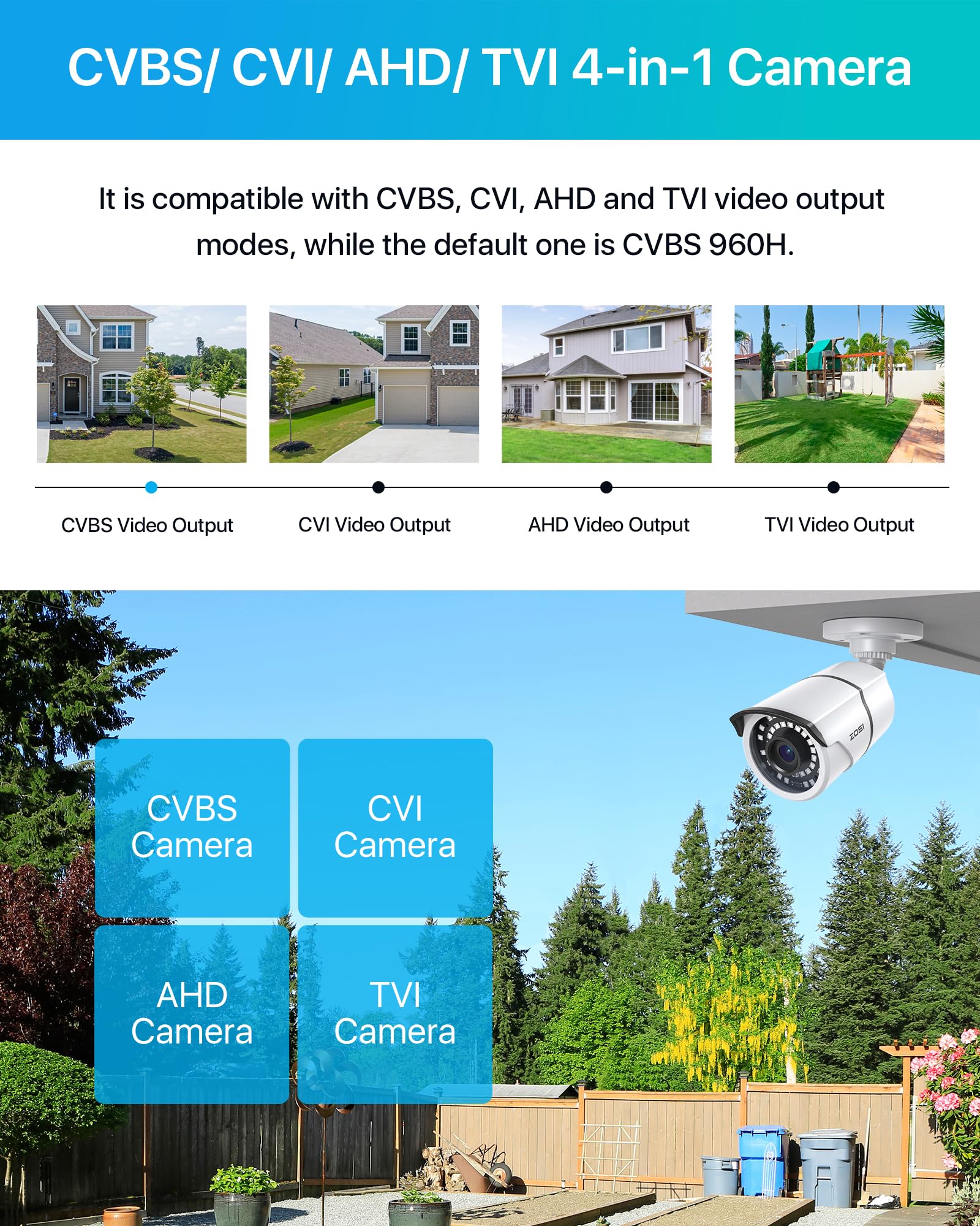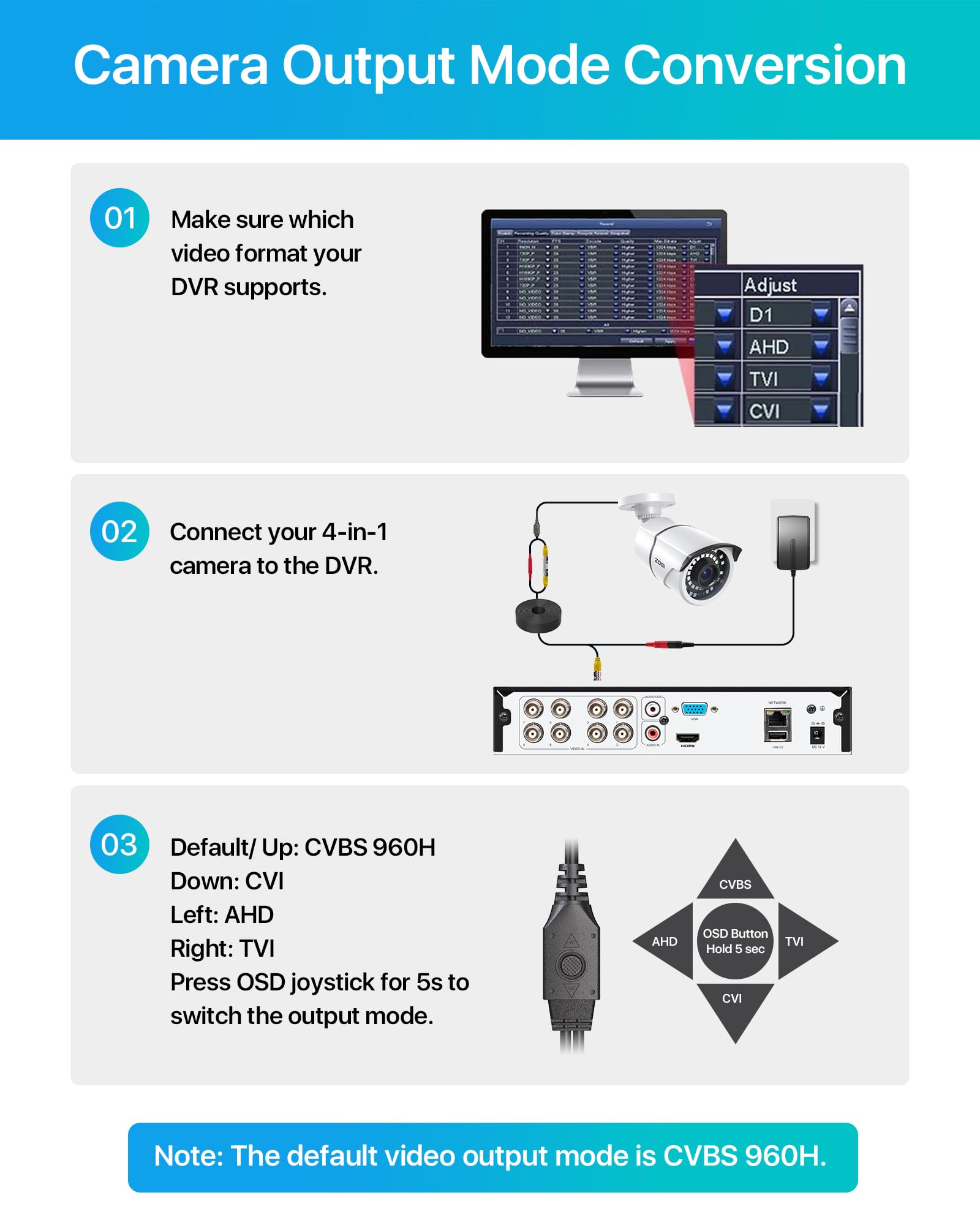 (1). [ 1080P Hybrid 4-in-1 HD-CVI/TVI/AHD/Analog ] __ It comes with OSD Menu which can change 4 different video output TVI/AHD/HD-CVI/CVBS and adjust the video settings.(The default mode is 960H. You can change the OSD Menu by holding the button for about 5 seconds)