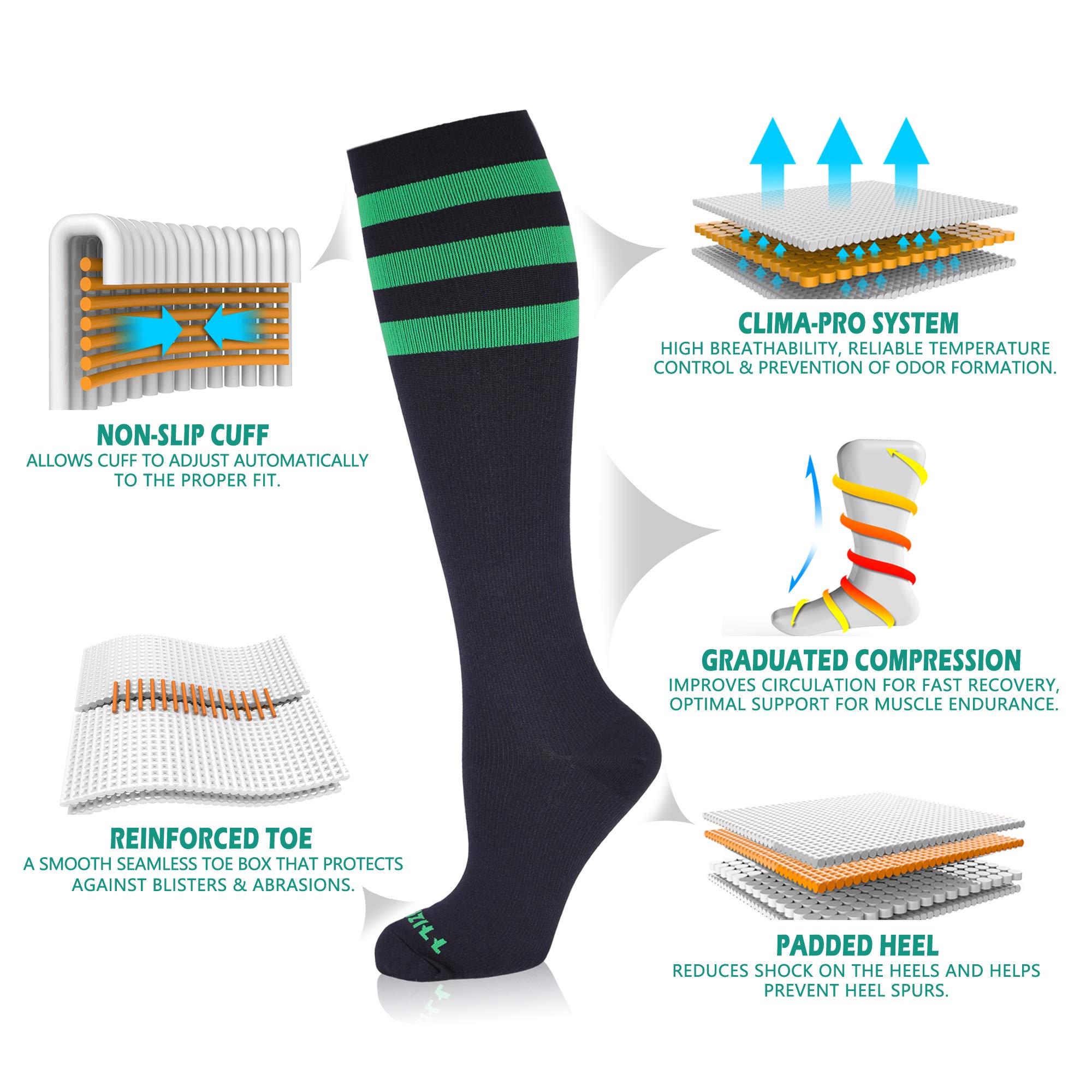 【Breathable & All-Day Comfort】Experience comfort with Newzill CLIMA-PRO Graduated Compression Socks (65% Polyamide / 35% Spandex / latex-free ). The seamless toe prevents rubbing, while breathable fabric keeps you cool and dry.