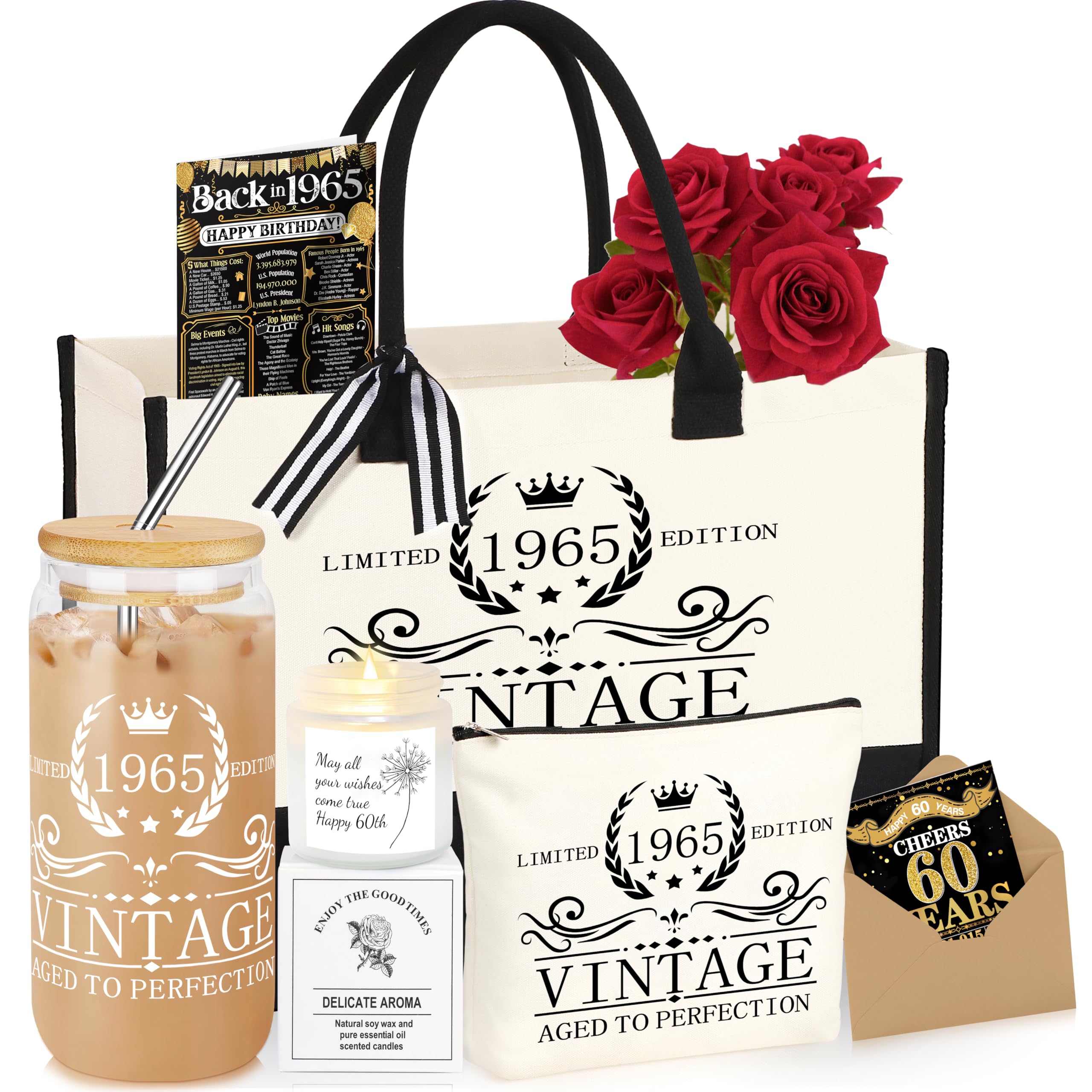60TH BIRTHDAY GIFTS FOR HER: This set of 60th birthday gifts includes: 1 X 1965 tote bag, 1 X makeup bag,1 X 1965 can glass, 1X 1965 scented candle and 1 X 1965 poster. The unique canvas handbag set will be a cute gift for women's 60th birthday. The idea of a 60th birthday gift is the perfect choice to make her smile on their special day. 60th birthday gift, 60th anniversary commemorative gift, 60th wedding commemorative gift, 60th anniversary commemorative gift