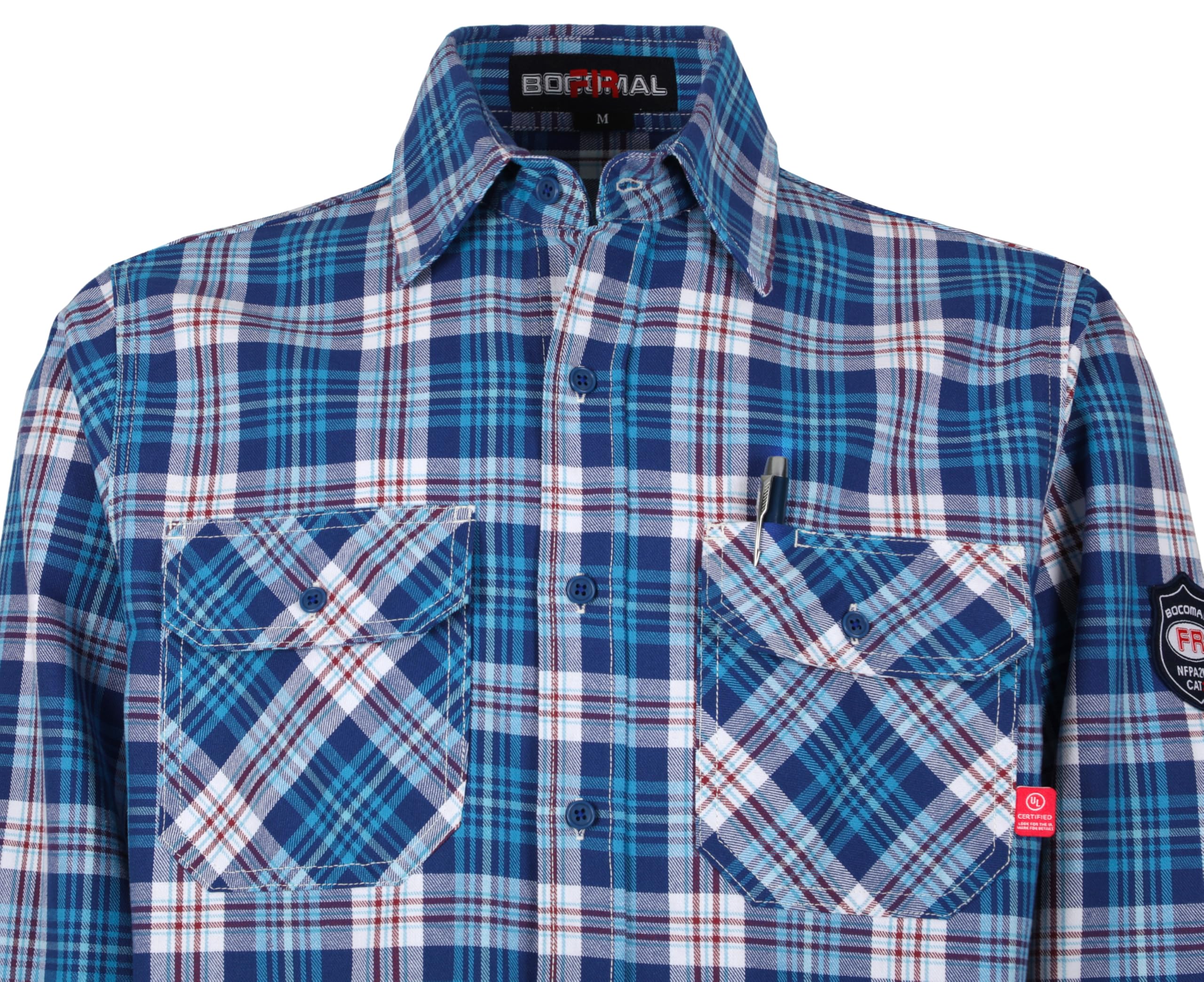 Functional FR MATRIALS:Water & Oil Repellent Finish.7oz Light weight Cotton Plaid Twill FR Treated,FR Buttons,FR Sewing Threads!Flame Resistant 100%C NFPA2112 Fire Retardant welding Shirt .Clear FR Tag on front.UL NFPA2112 Classifeid,More FR info On Neck Tag about UL Certification.We Attached A Small Sample Inside Package for Cunstomers Simple FR Try