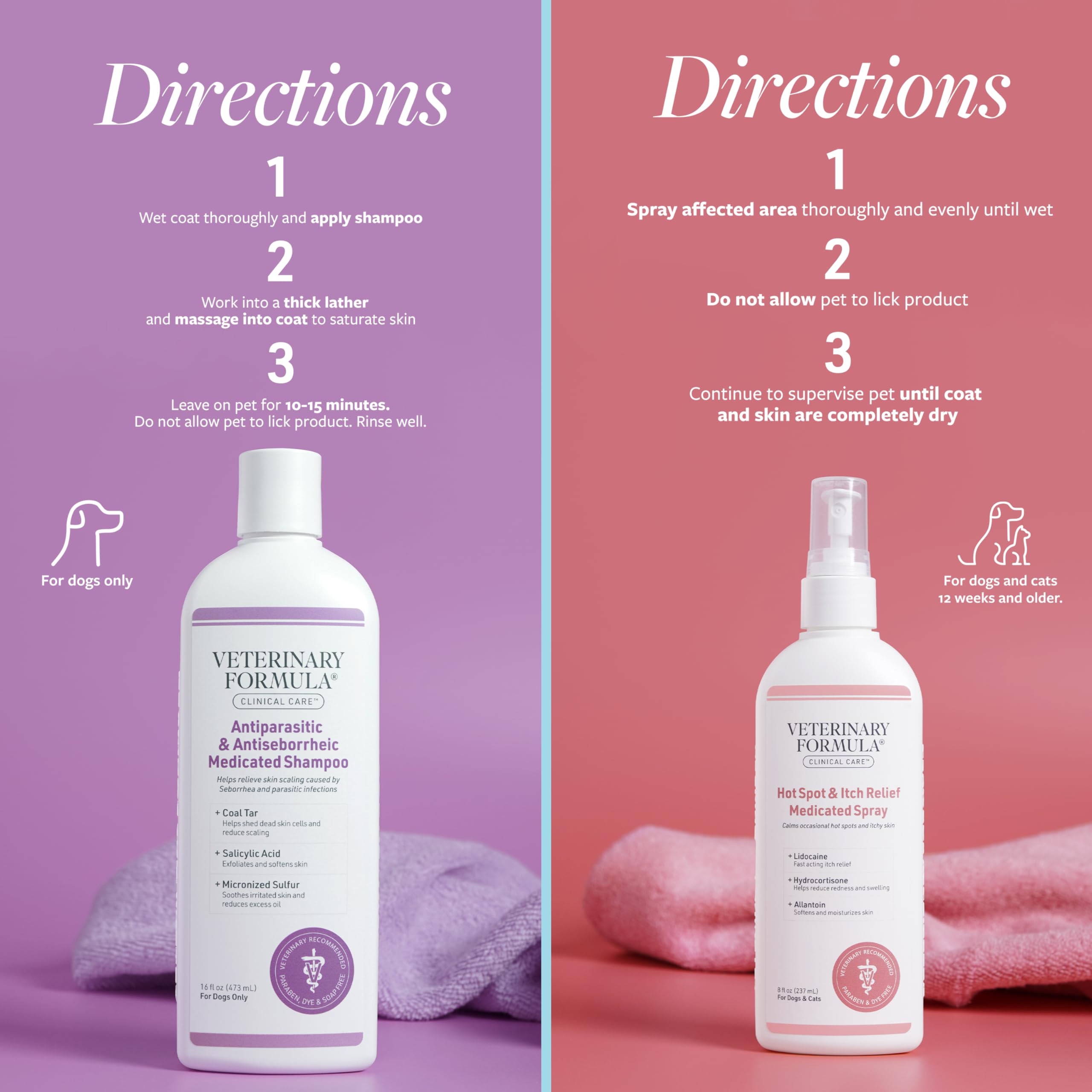 Product 2: FOR DOGS AND CATS – Intended for topical use only, spray this non-irritating formula on pets over 12 weeks of age to help discourage compulsive licking and help alleviate itching.