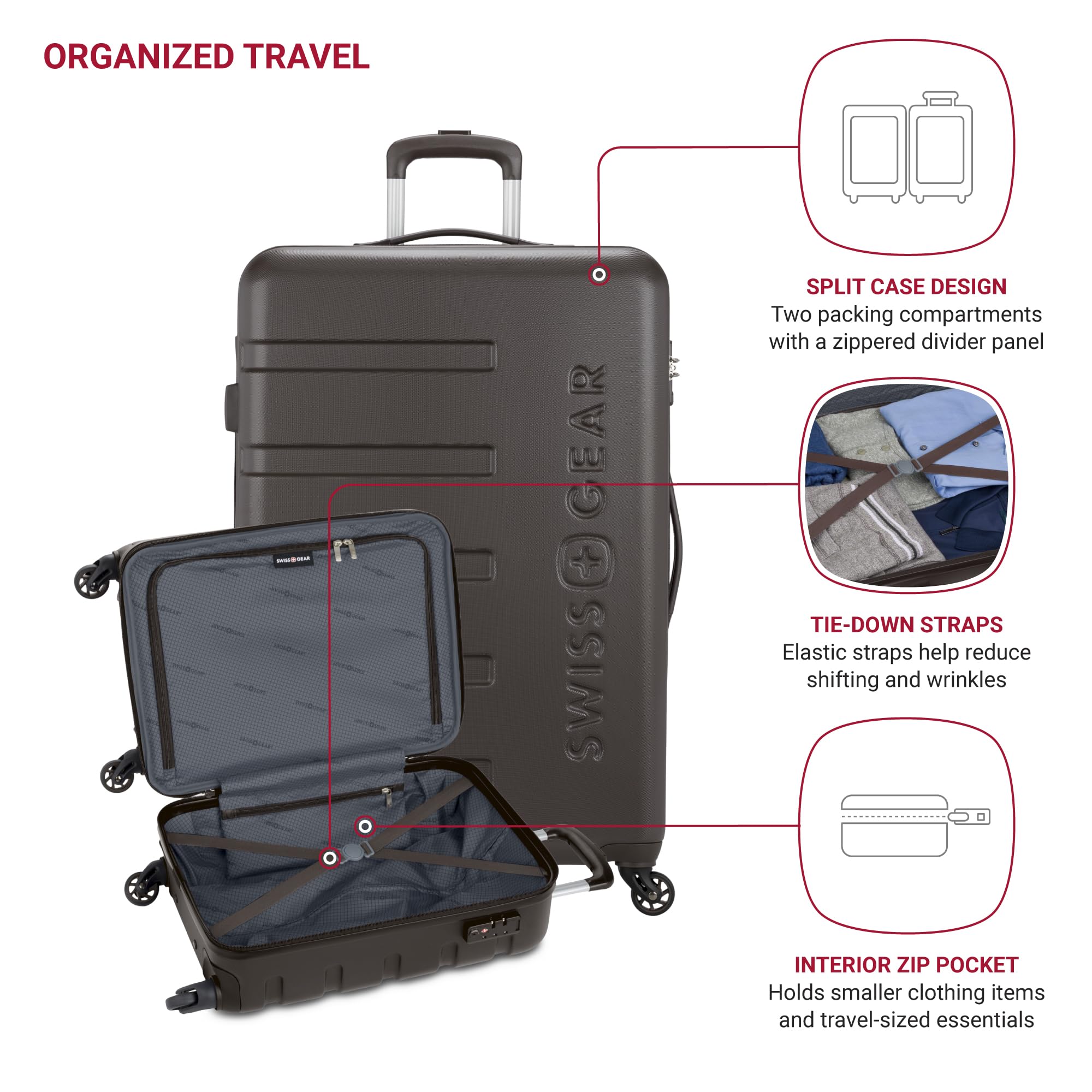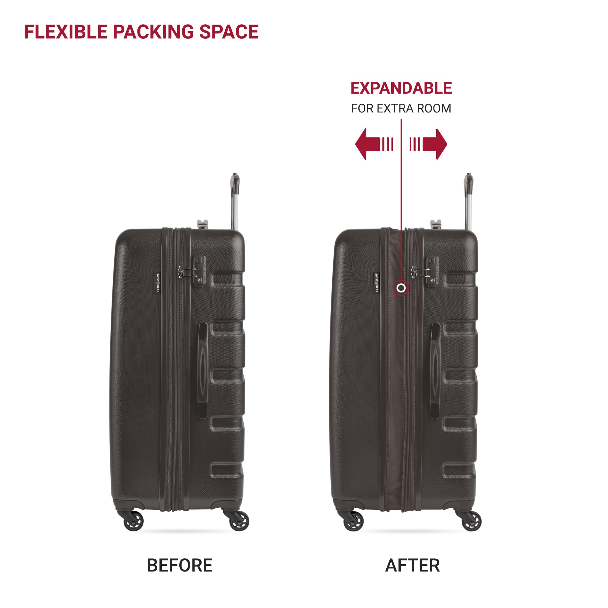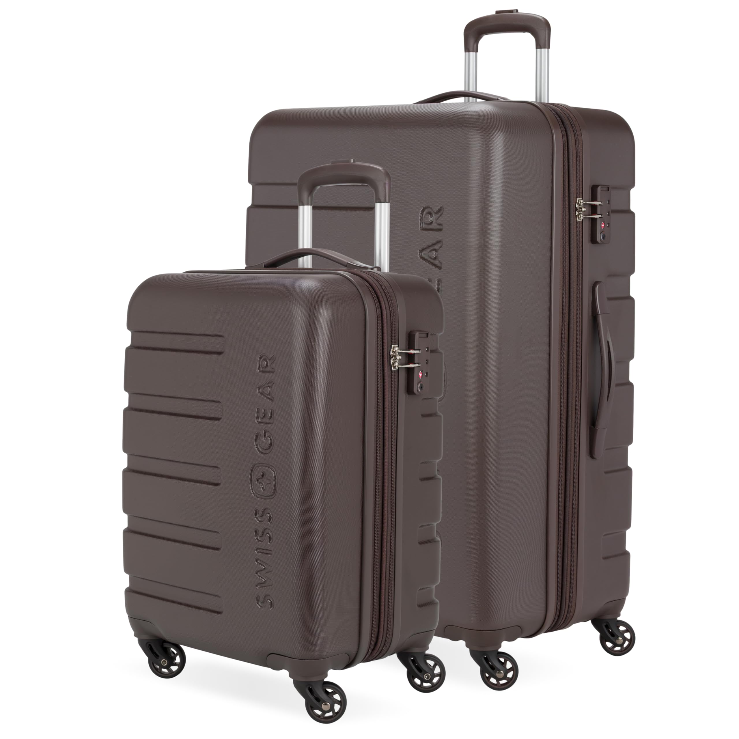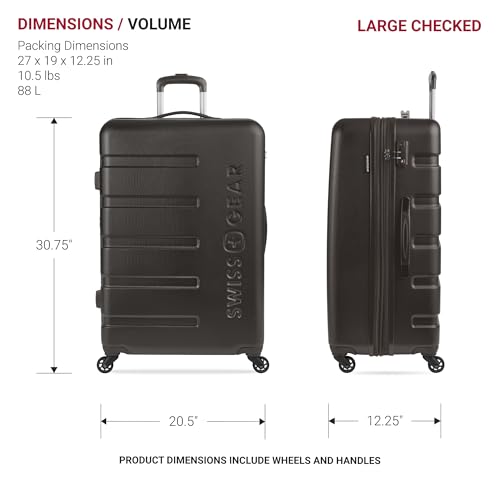 Description Travel in style with the SwissGear Signature Expandable Hardside Luggage Set. Both modern and utilitarian, its lustrous metal zippers and rugged construction exemplify its long-lasting quality. The set contains the 19” Carry-On and a 27" Expandable Hardside Luggage. Its almost indestructible split case opens to display the main compartment equipped with tie-down clothing straps, a roomy zippered lid pocket, and a large zippered packing pocket to keep your travel-sized essentials separate from your clothes. It also includes a premium steel locking handle, four 360-degree wheels, expandable packing space, and a molded grab handle. Guaranteeing extra security with its built-in TSA-approved three-dial combination lock, make this a go-to for your upcoming voyage because, whether traveling for business or pleasure, this is doing adventure the right way.