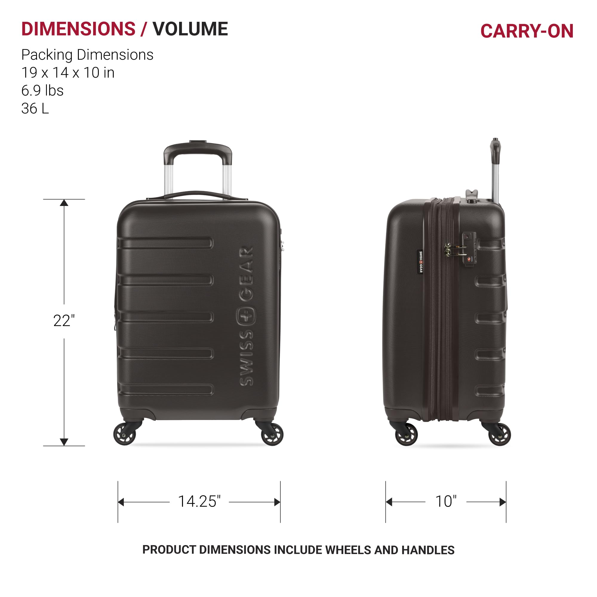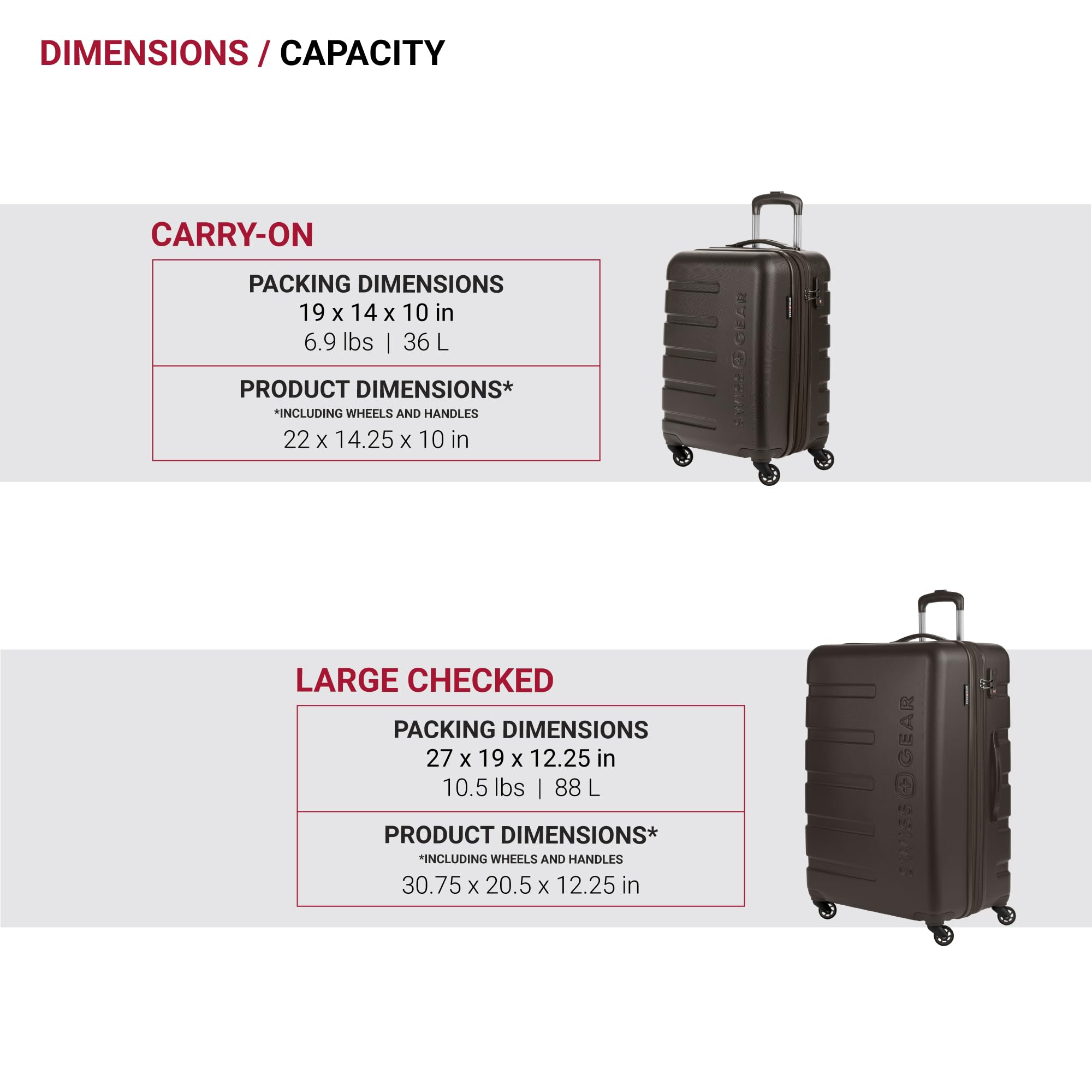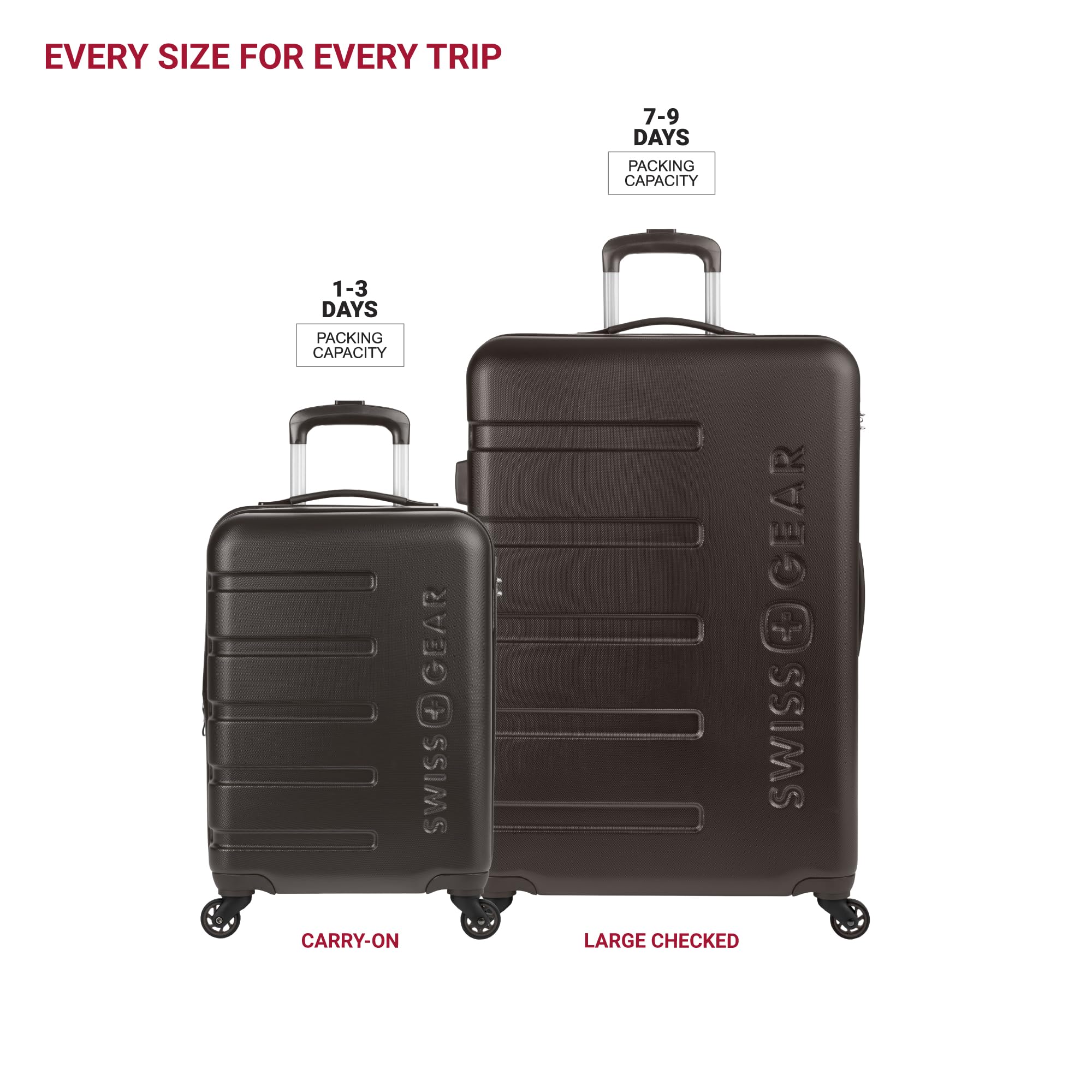 Description Travel in style with the SwissGear Signature Expandable Hardside Luggage Set. Both modern and utilitarian, its lustrous metal zippers and rugged construction exemplify its long-lasting quality. The set contains the 19” Carry-On and a 27" Expandable Hardside Luggage. Its almost indestructible split case opens to display the main compartment equipped with tie-down clothing straps, a roomy zippered lid pocket, and a large zippered packing pocket to keep your travel-sized essentials separate from your clothes. It also includes a premium steel locking handle, four 360-degree wheels, expandable packing space, and a molded grab handle. Guaranteeing extra security with its built-in TSA-approved three-dial combination lock, make this a go-to for your upcoming voyage because, whether traveling for business or pleasure, this is doing adventure the right way.